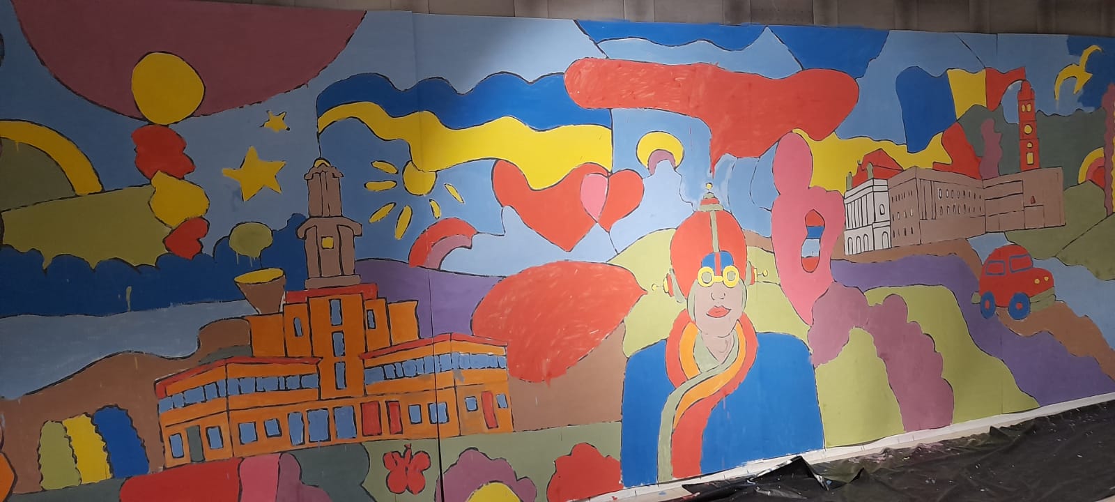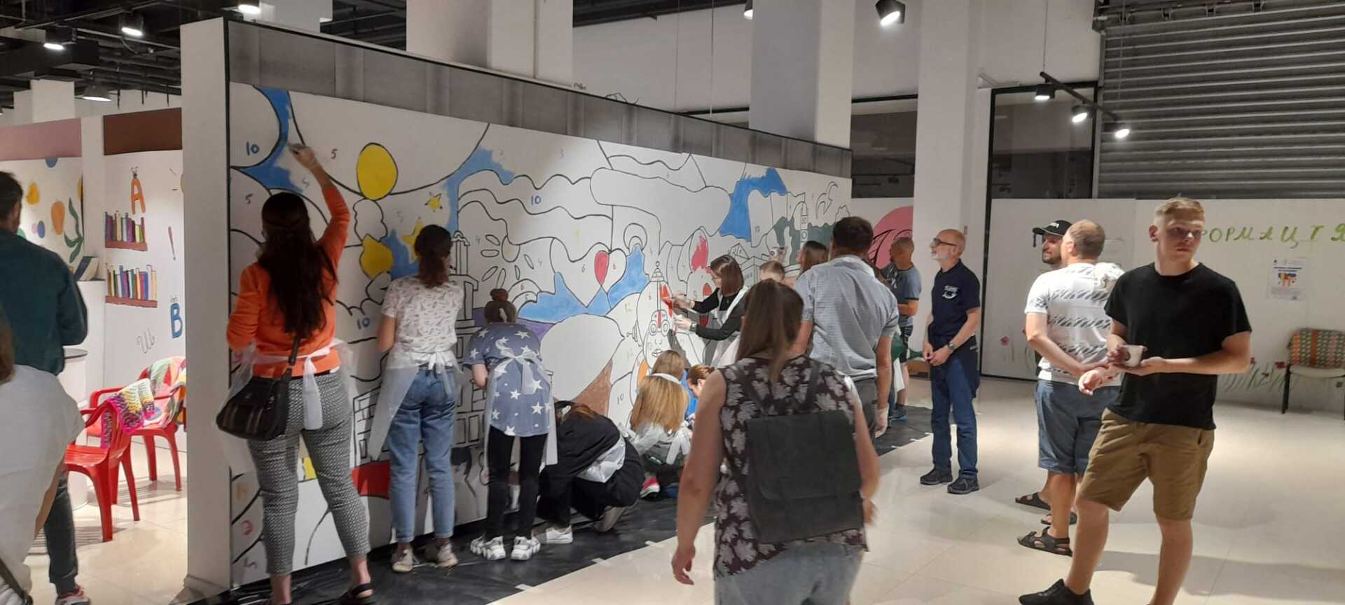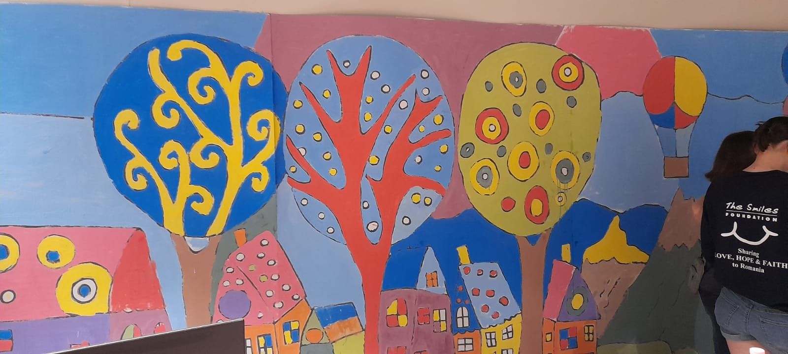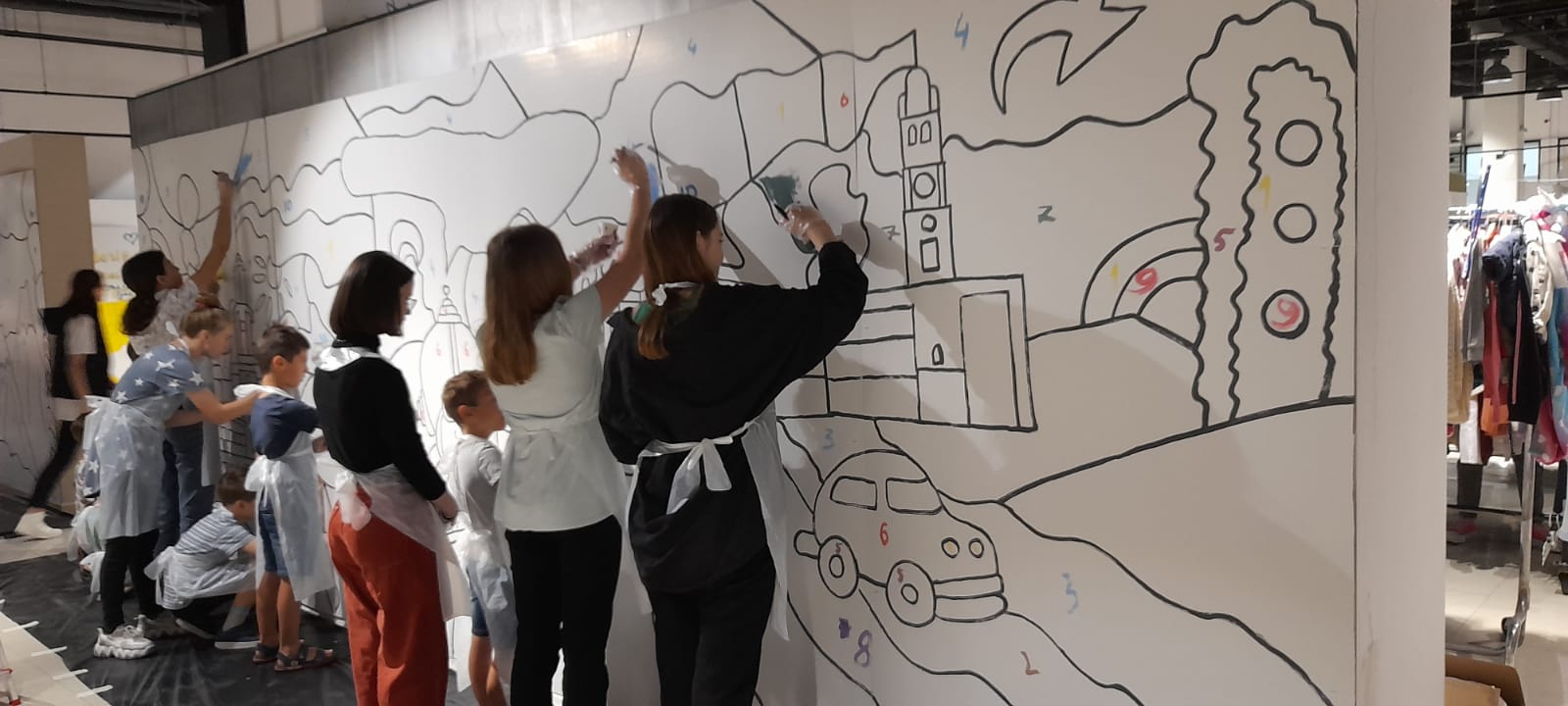 a atras atenția artistului, care a pregătit conturul mural urmând ca la final să rezulte un desen durabil și luminos, realizat prin creativitatea comună a copiilor.