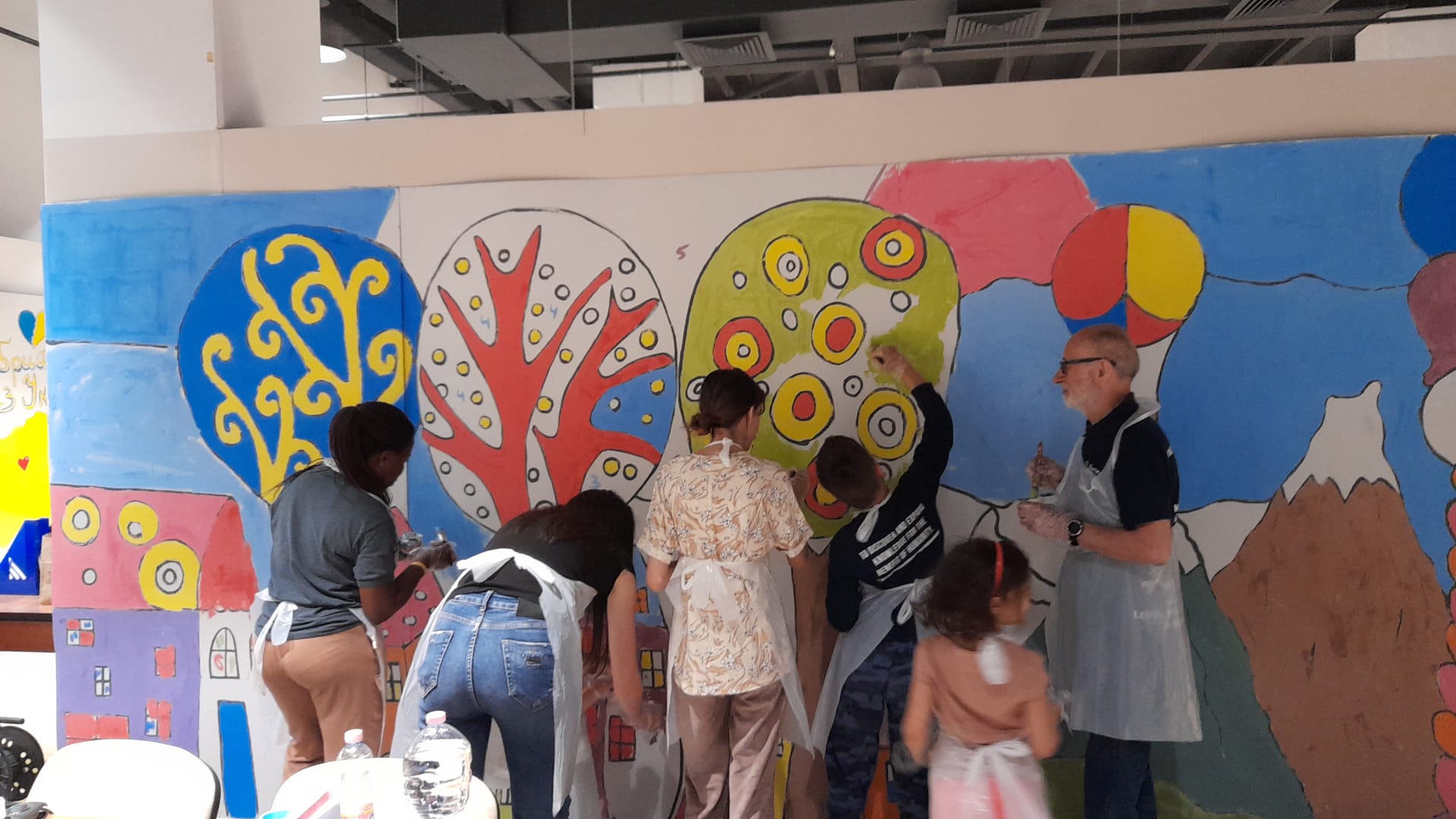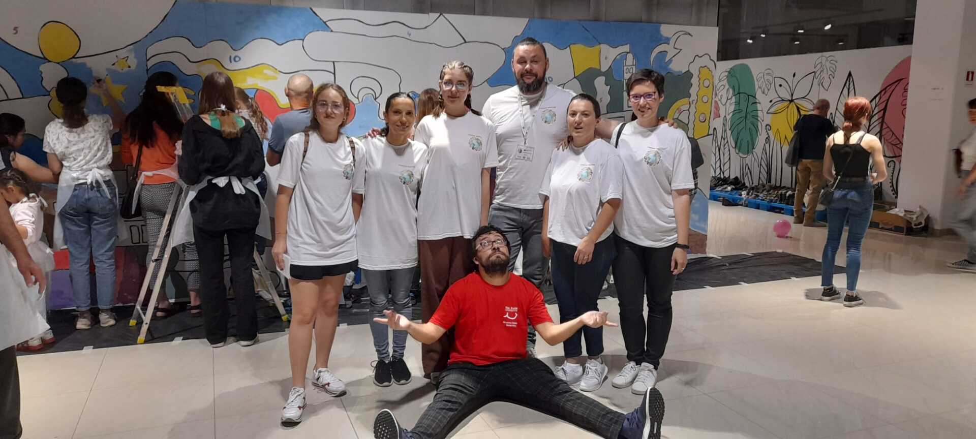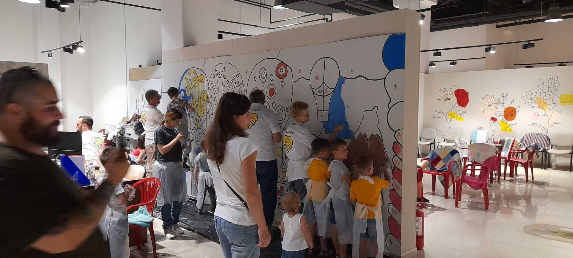a atras atenția artistului, care a pregătit conturul mural urmând ca la final să rezulte un desen durabil și luminos, realizat prin creativitatea comună a copiilor.