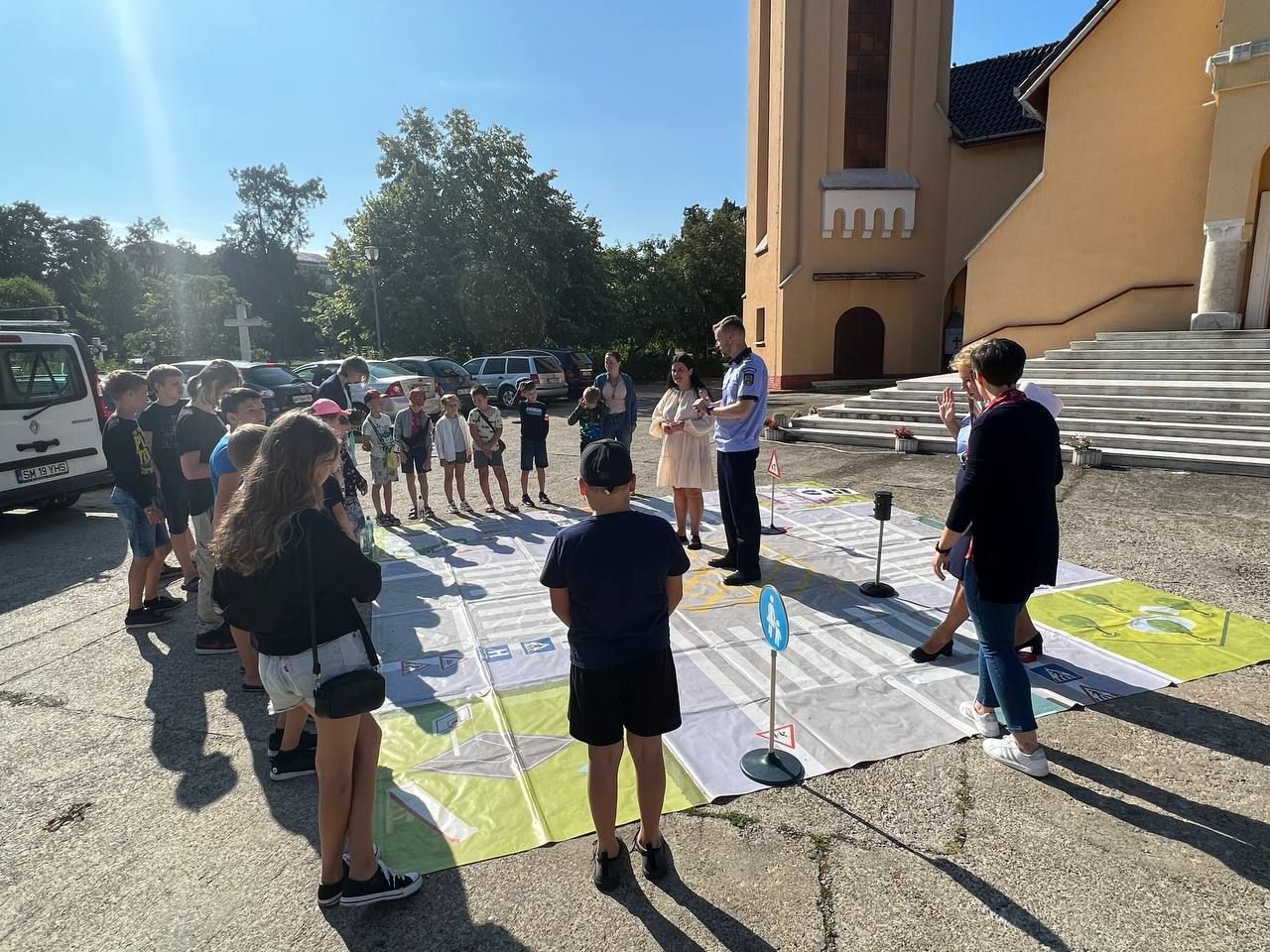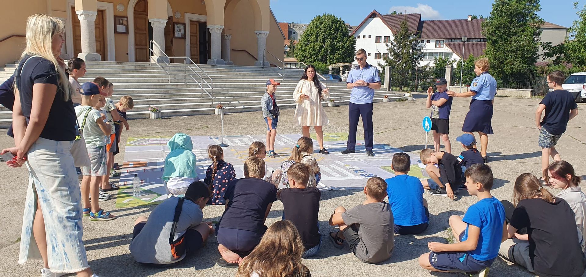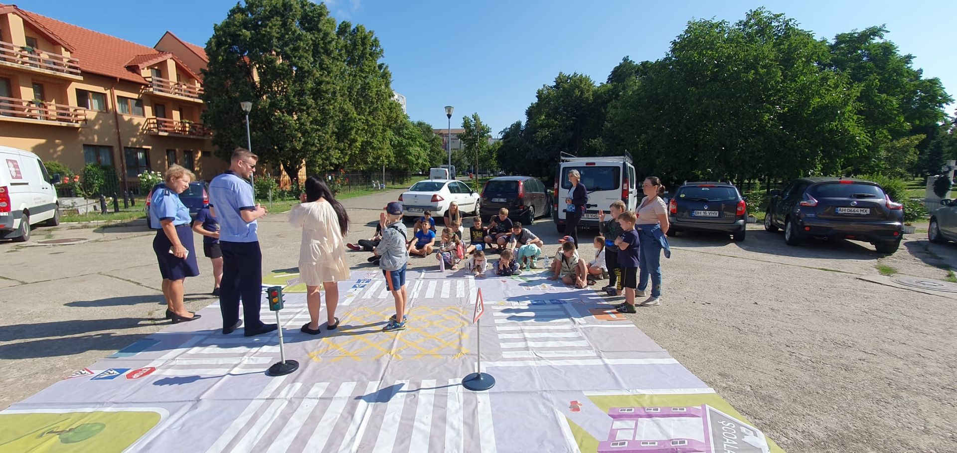 Pentru a le explica tinerilor ucraineni într-un mod interactiv noțiunile de siguranță rutieră, reprezentanții poliției le-au pregătit un covoraș cu clădiri, străzi și indicatoare rutiere, pe care micuții l-au folosit pentru a învăța și exersa regulile de trafic pentru pietoni și bicicliști.