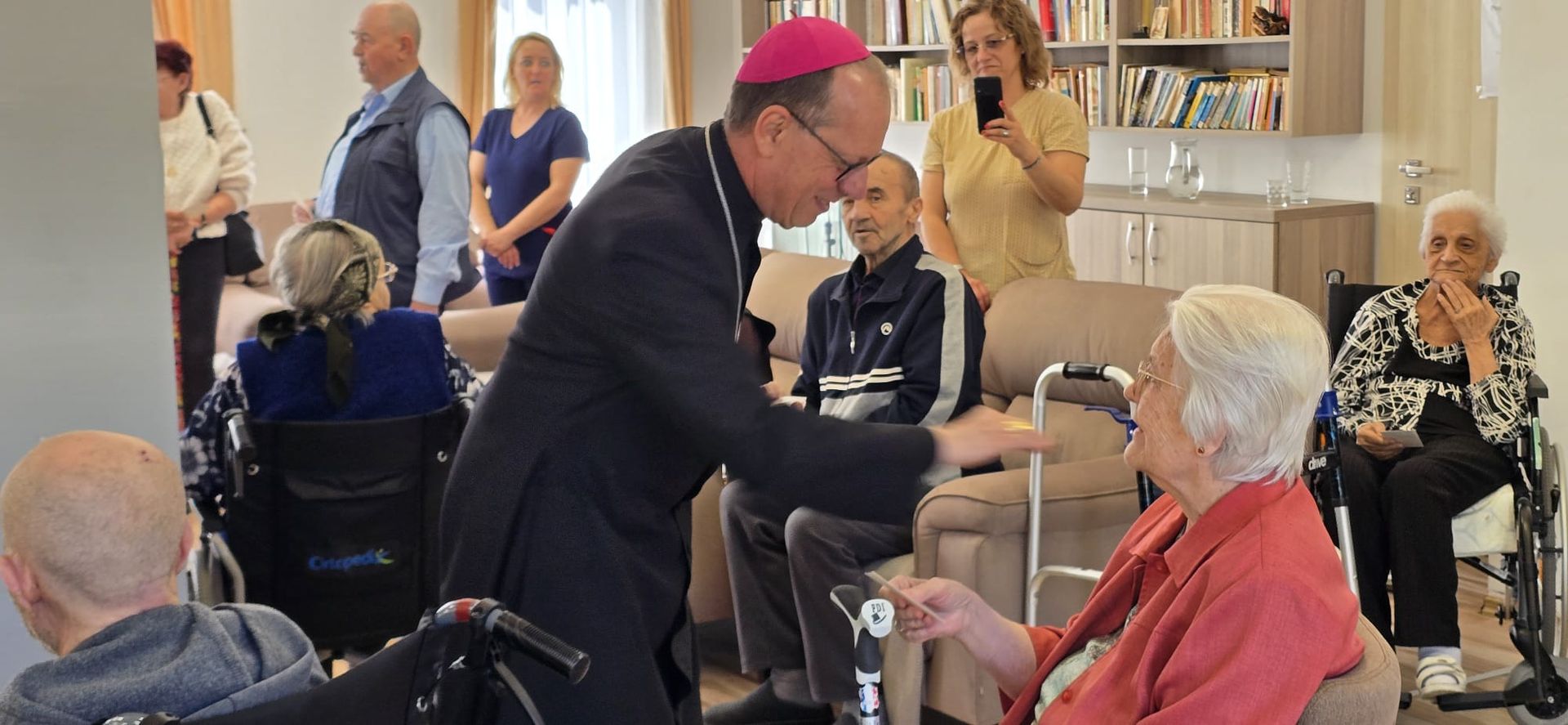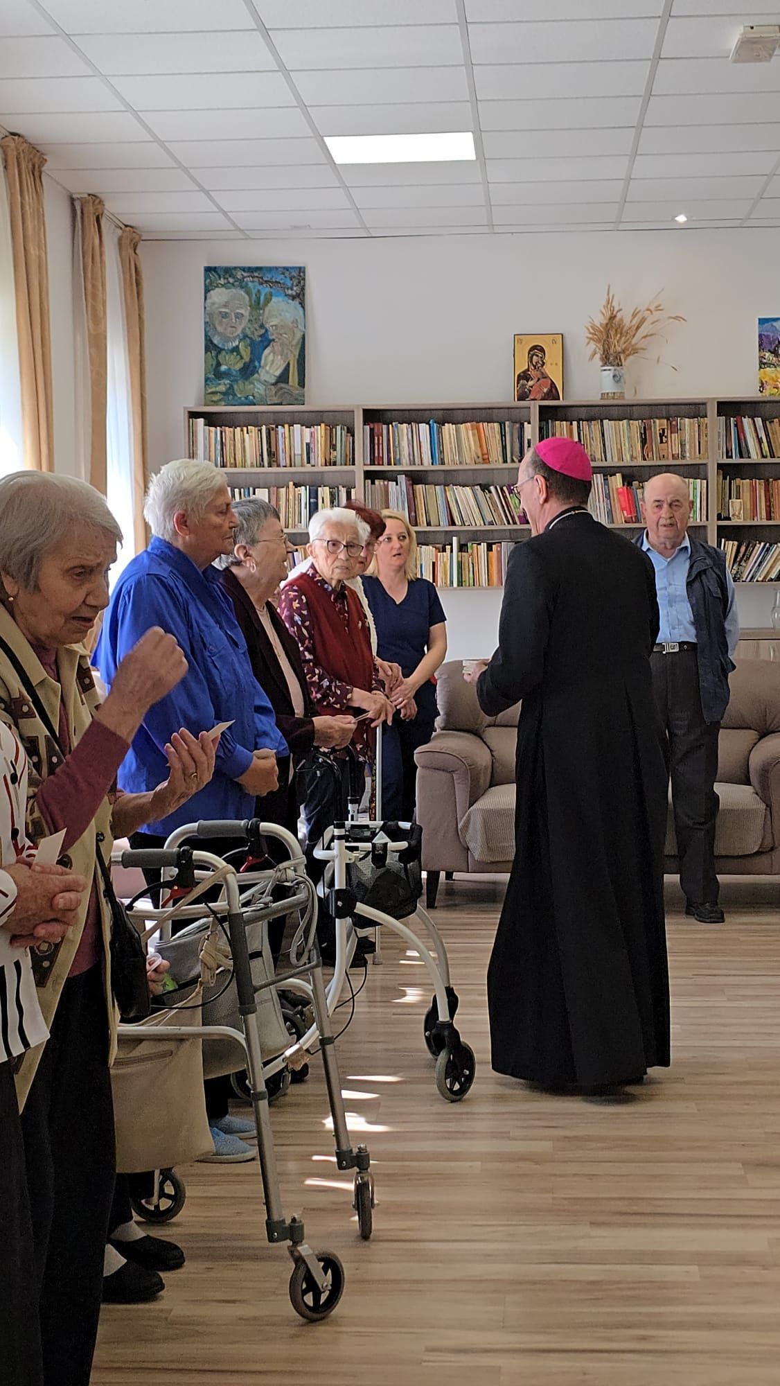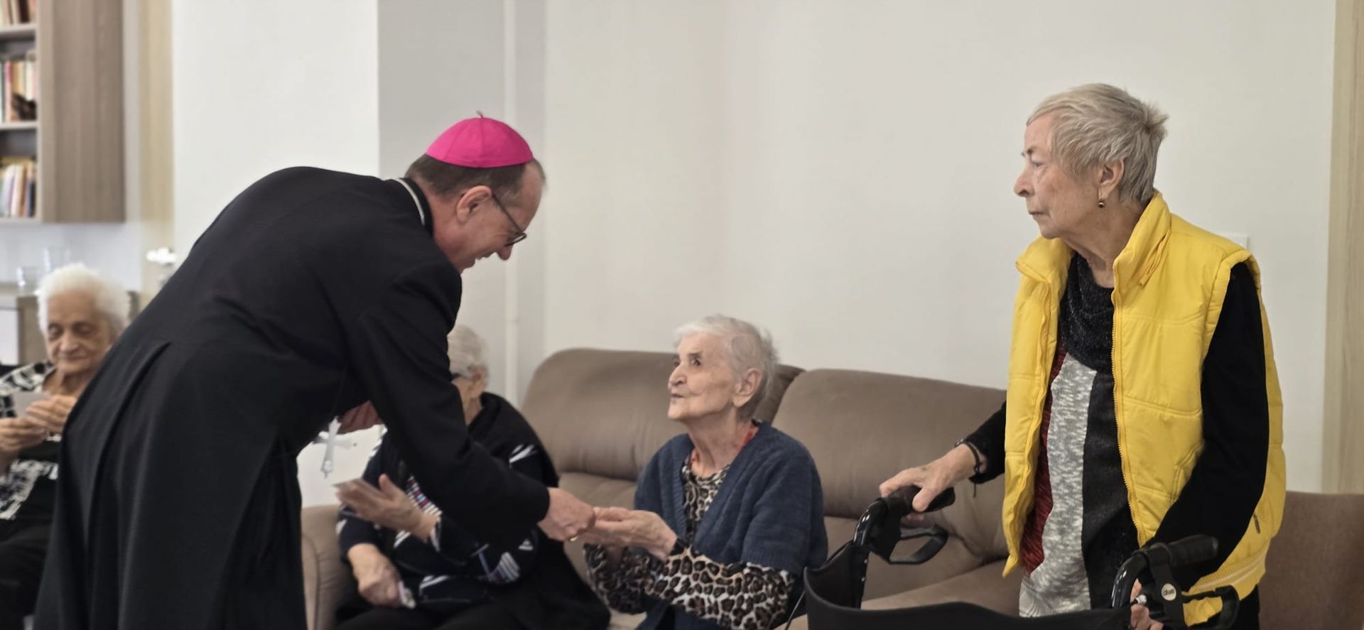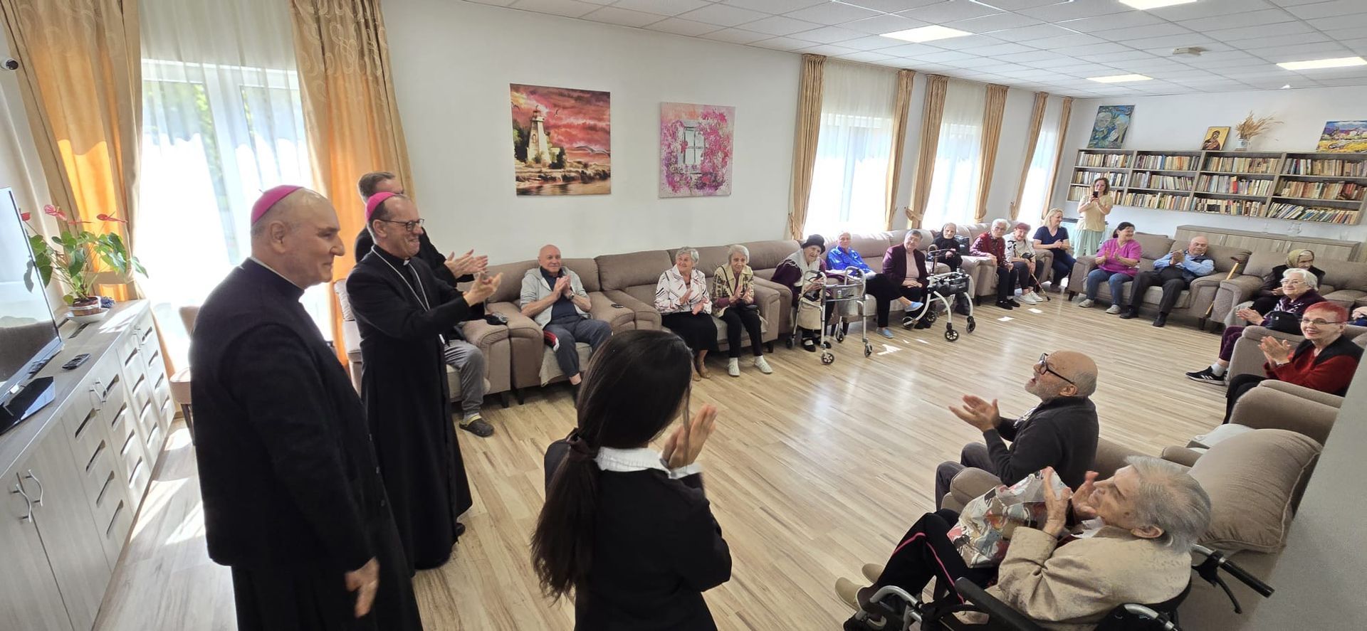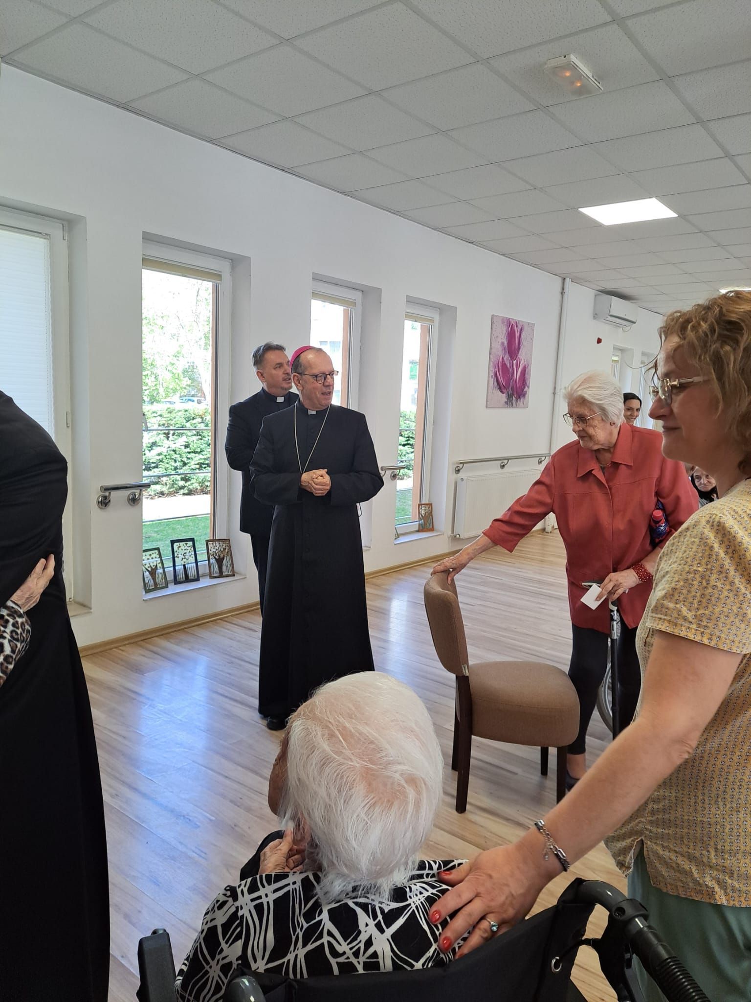 Într-o atmosferă caldă, plină de sensibilitate și trăire creștină, rezidenții „Casei Frențiu” au avut parte de o surpriză deosebită: întâlnirea cu Preasfinția Sa Virgil Bercea, Episcopul greco-catolic de Oradea și cu Excelența Sa Monseniorul Giampiero Gloder, Nunțiul Apostolic în România și în Republica Moldova. Oaspeți care au adus alinare, speranță și un sentiment profund de binecuvântare astăzi, 11 aprilie a.c. Alături de aceștia s-au aflat și președintele Asociației Caritas Eparhial Oradea, pr. Olimpiu Todorean precum și pr. Mihai Vătămănelu, vicar general.