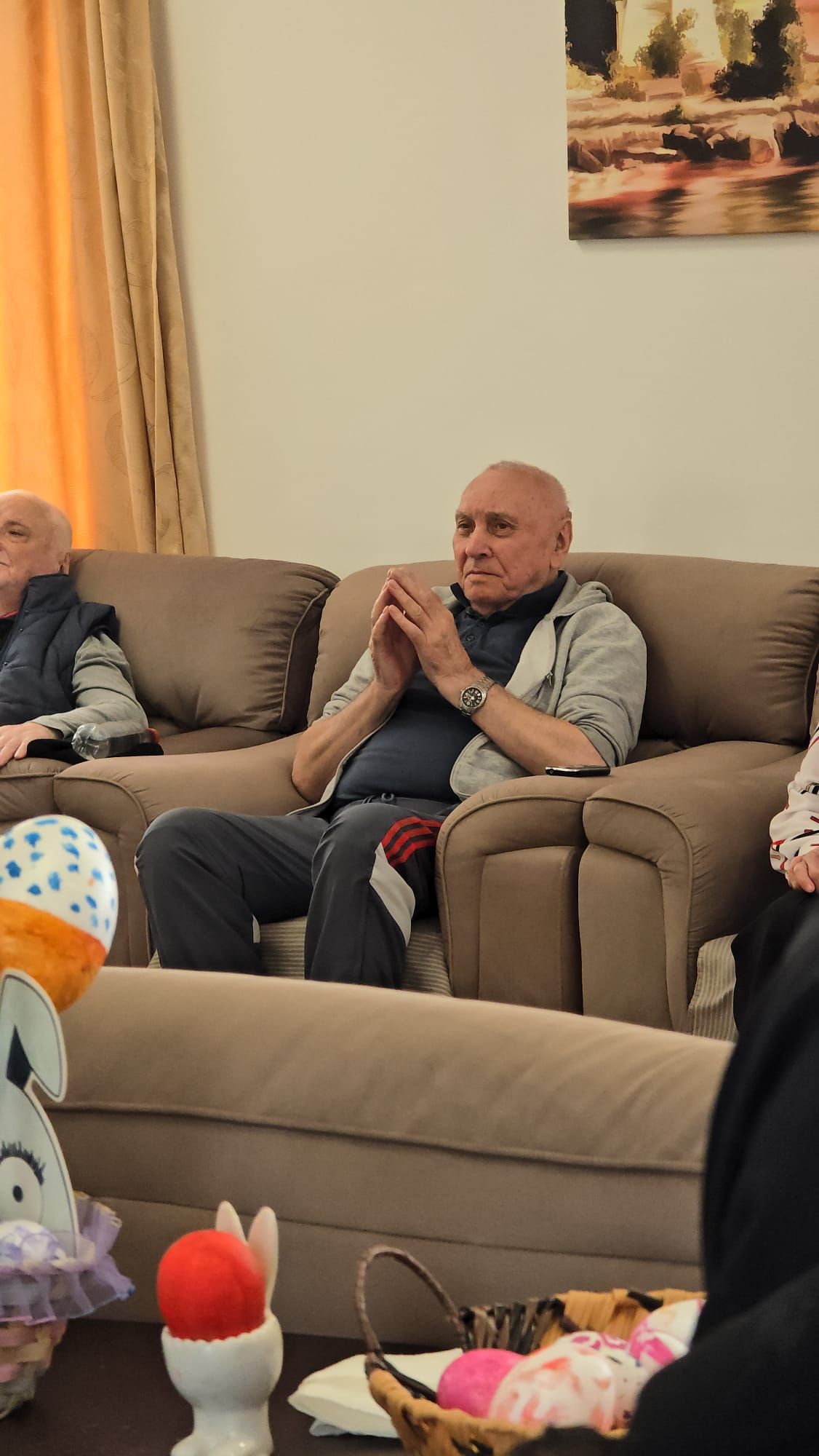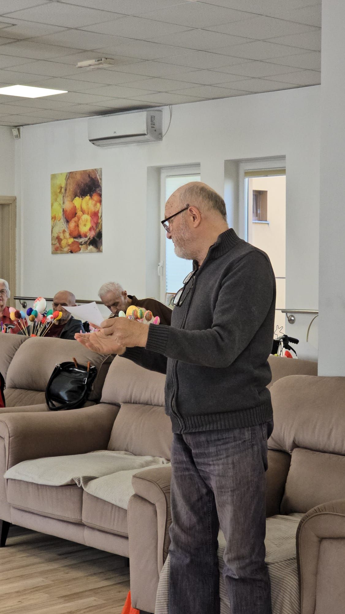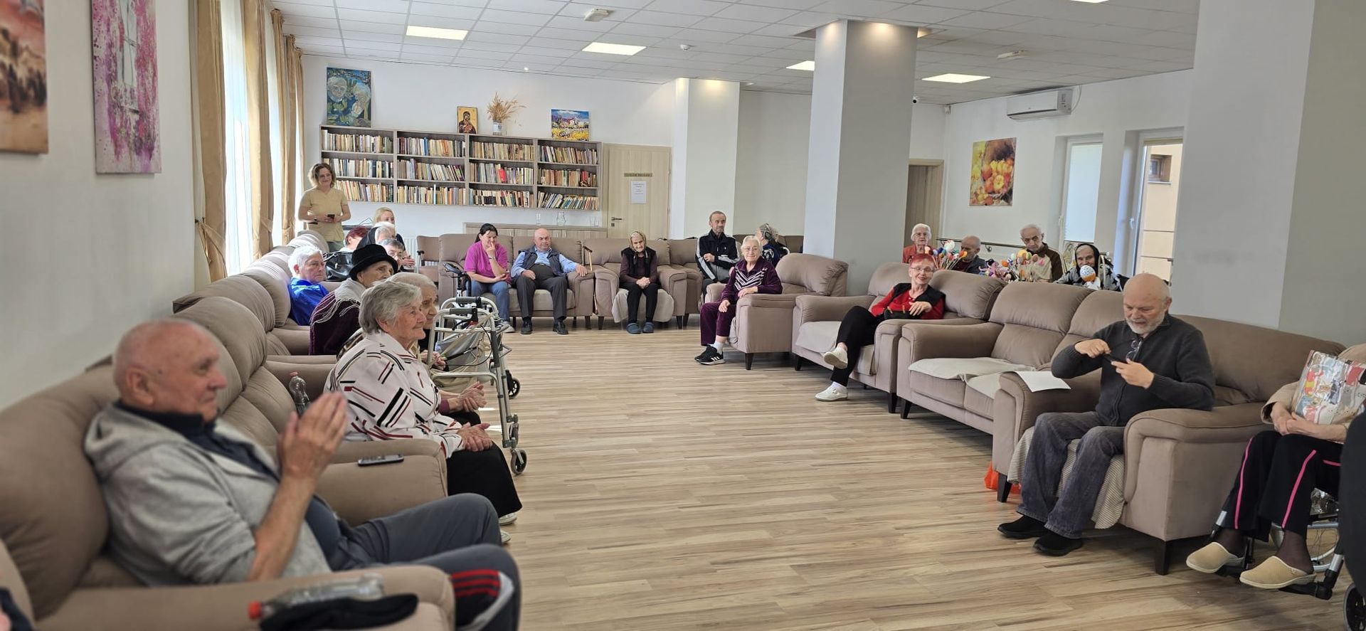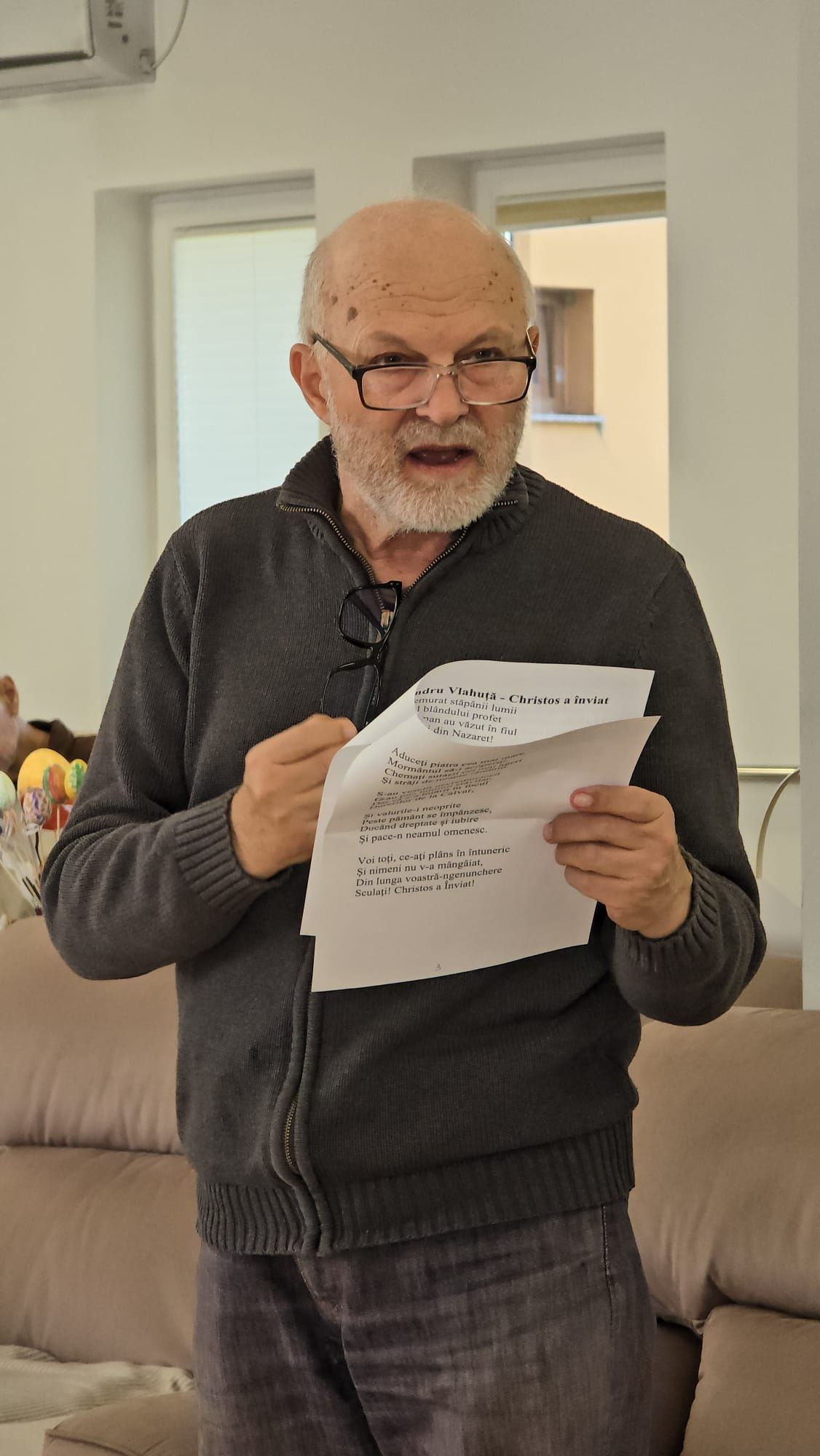 Întâlnirea a fost marcată de momente de o intensitate emoțională aparte. Într-un glas, cu inimile deschise și pline de credință, cei prezenți au cântat „Cristos a înviat!”, iar ecoul acestei cântări a umplut spațiul de lumină și speranță, creând o legătură profundă între toți cei de față. A urmat un moment deosebit de sensibil: recitarea unei poezii cu specific pascal, susținută de unul dintre rezidenți. Cu o rostire solemnă, sobră și plină de trăire interioară a poeziei „Cristos a înviat!” scrisă de Alexandru Vlahuță, domnul Emil Sauciuc a reușit să redea, cu o autenticitate rară, esența sărbătorii Învierii Mântuitorului, stârnind emoție și admirație în rândul celor prezenți.