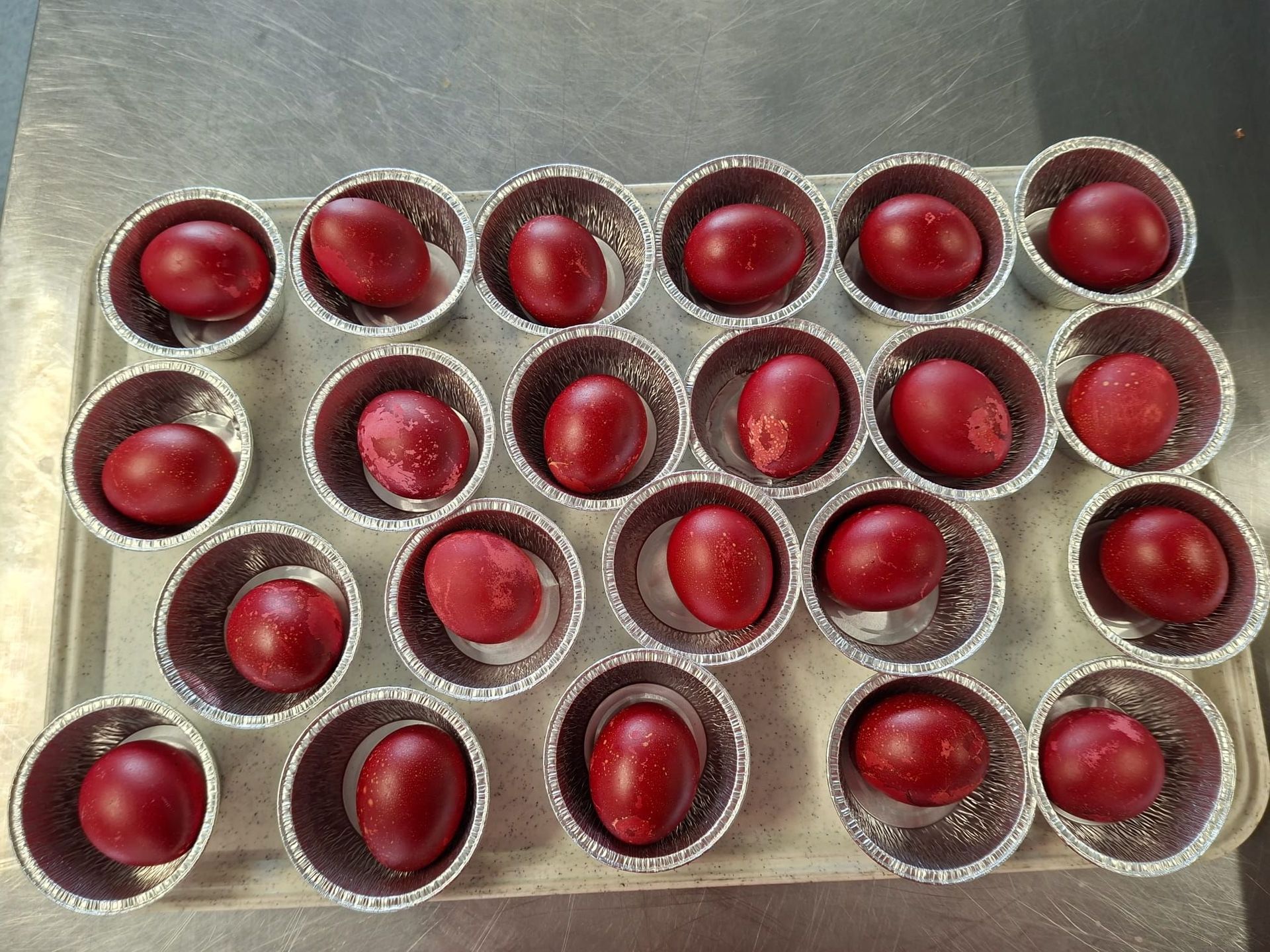 Meniul tradițional, pregătit cu grijă, a adus gustul autentic al sărbătorii: ciorbă țărănească cu carne de porc, piure cu friptură de porc, cozonac, ouă roșii, vin roșu și cafea. Într-o atmosferă încărcată de emoție, cei prezenți au cântat împreună „Cristos a înviat!”