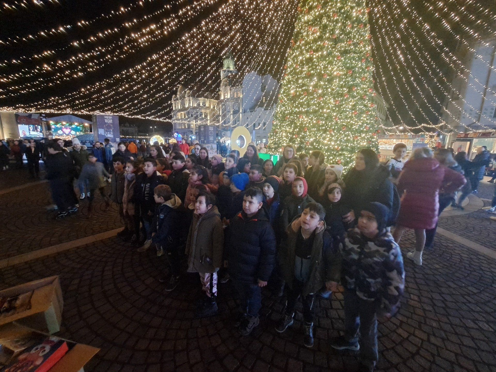 Vizita copiilor la Târgul de Crăciun s-a încheiat la lăsarea serii cu un colind sub bradul luminat, colind dedicat Asociației APTOR, care le-a făcut o surpriză oferindu-le câte un cadou.