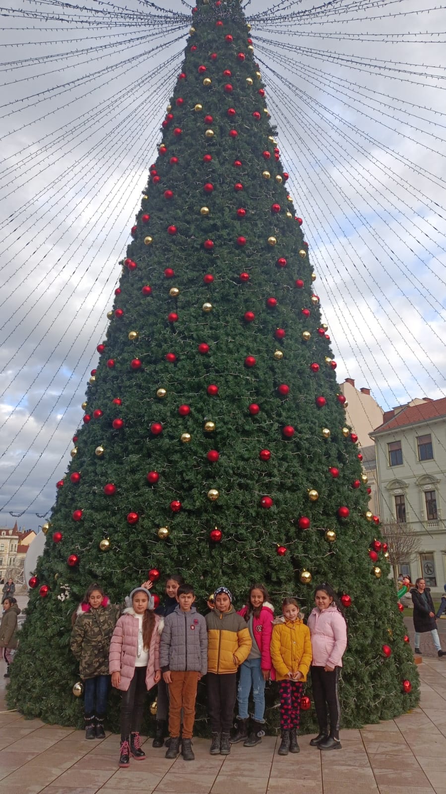 Următoarea destinație a fost vizitarea Târgului de Crăciun, unde copiii plini de energie și entuziasm au explorat și s-au bucurat de magia sărbătorilor de iarnă, având acces gratuit la trenuleț și carusel oferit de Asociația pentru promovarea turismului din Oradea, (APTOR), apoi au vizitat căsuța lui Moș Crăciun și au admirat roata mare.