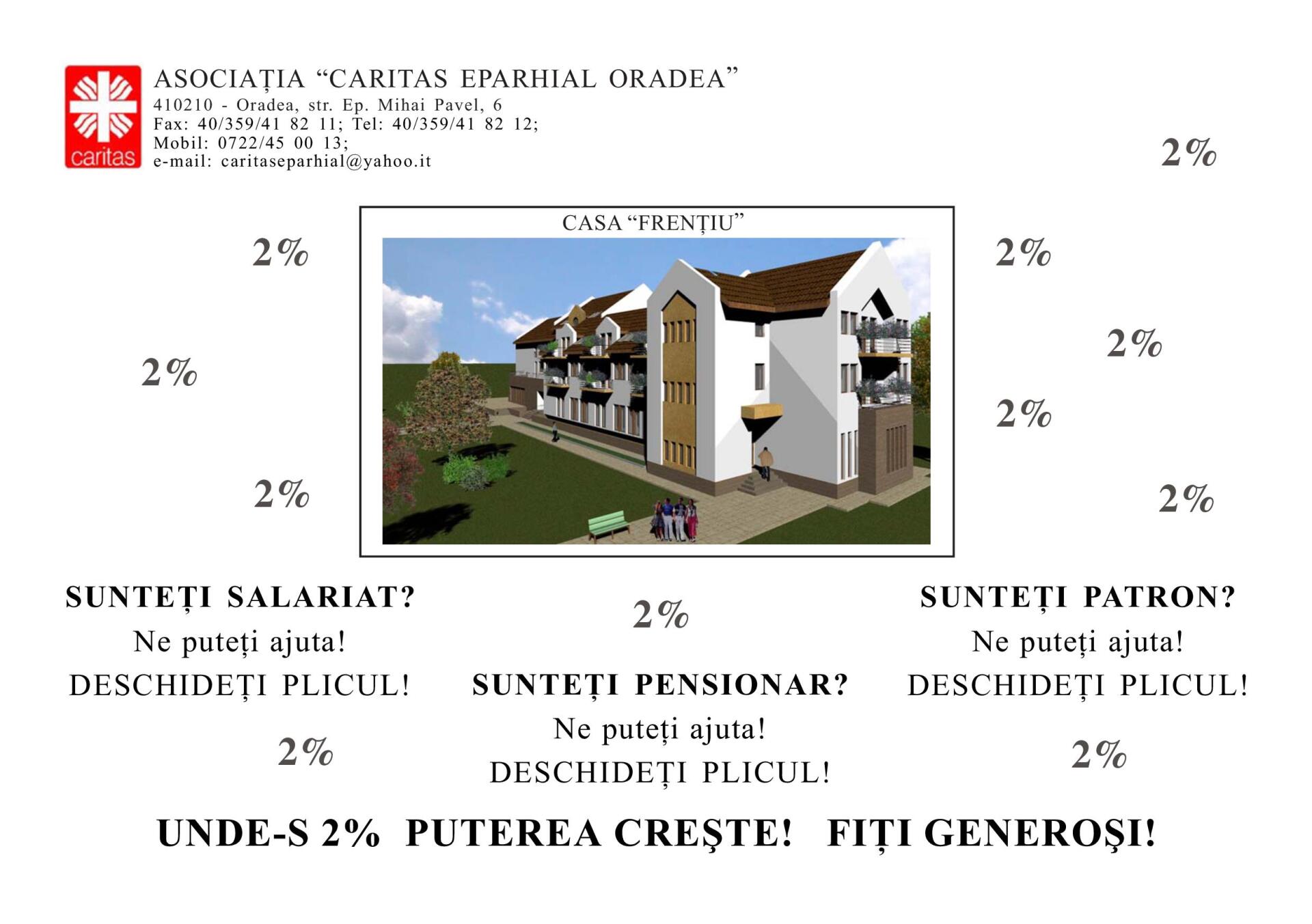 În anul 2007, în campania ”Din nou împreună cu 2%” am distribuit 10.000 de plicuri și 200 de afișe pentru redirecționarea a 2%. În Municipiul Oradea și în Eparhia de Oradea, am organizat două seminarii de pregătire pentru cei 50 de voluntari implicați în distribuirea plicurilor.