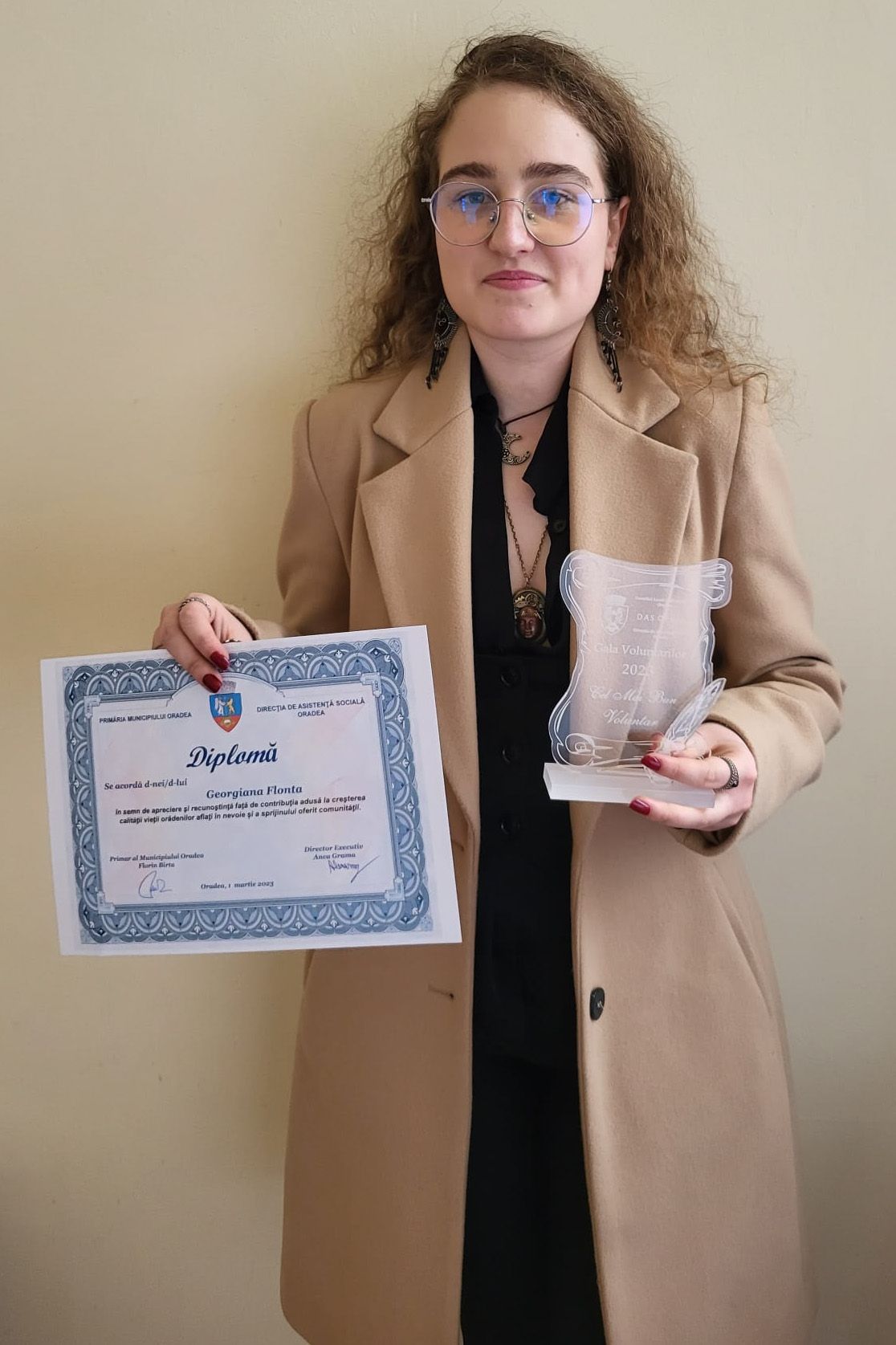 Georgiana a câștigat Premiul „Voluntarul anului” 2022 în cadrul Zilei Voluntarului Caritas și continuă să ne sprijine în toate activitățile pe care le desfășurăm, având toate atributele pe care ne bucurăm să le regăsim într-un voluntar.