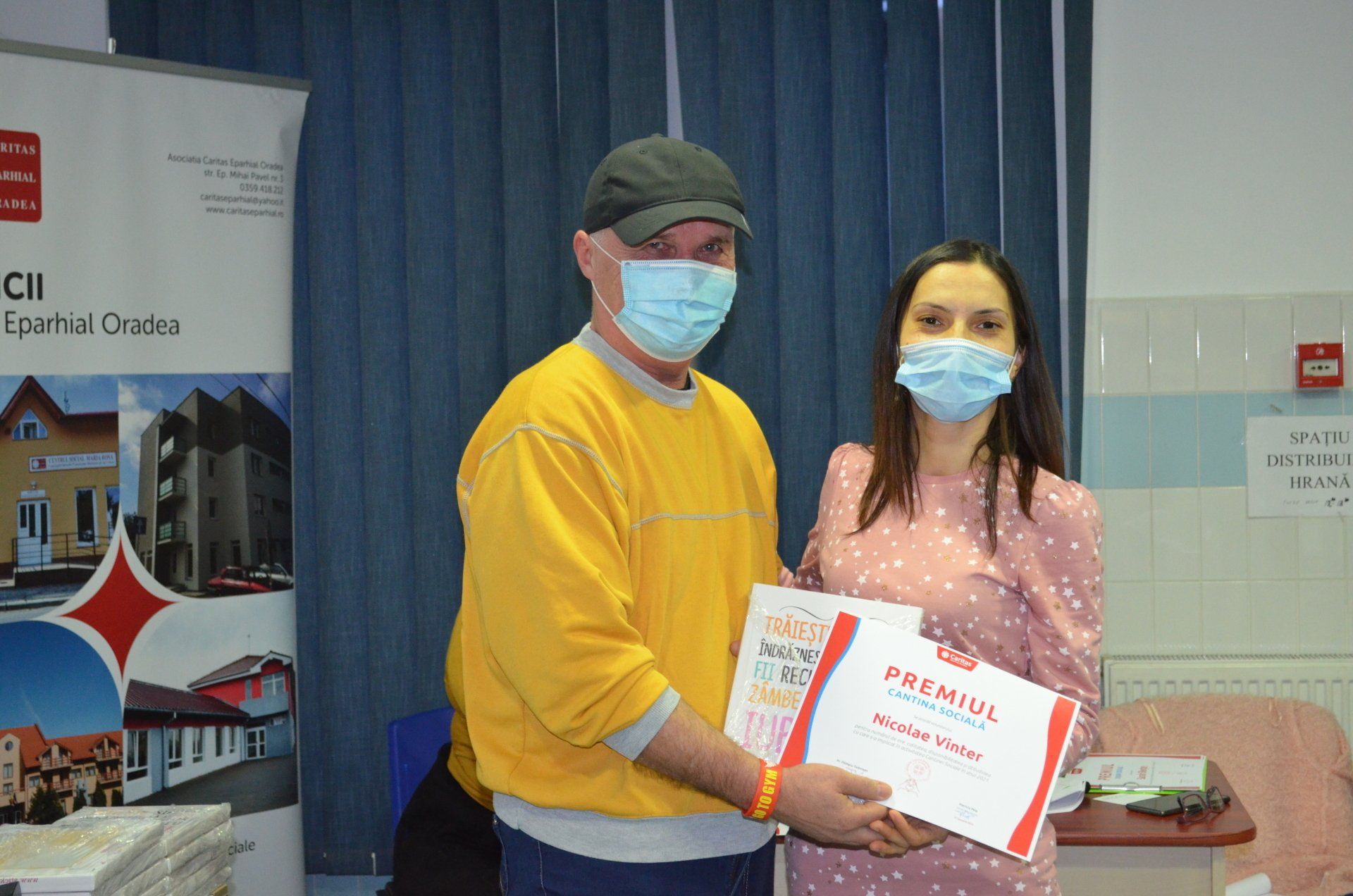 În momente dificile, a ales să rămână alături de cei vulnerabili, de cei singuri, de cei în vârstă, de cei ai nimănui și mai ales, alături de noi, pentru ca împreună să DĂRUIM! Unul dintre voluntarii activi ai asociației noastre s-a implicat, a sprijinit și a dăruit, alături de noi în perioada Pandemiei de Covid-19, hrana beneficiarilor Cantinei sociale. A participat zilnic la pregătirea și distribuirea mâncării, beneficiarilor Cantinei sociale, acumulând în acest sens 936 ore de voluntariat.