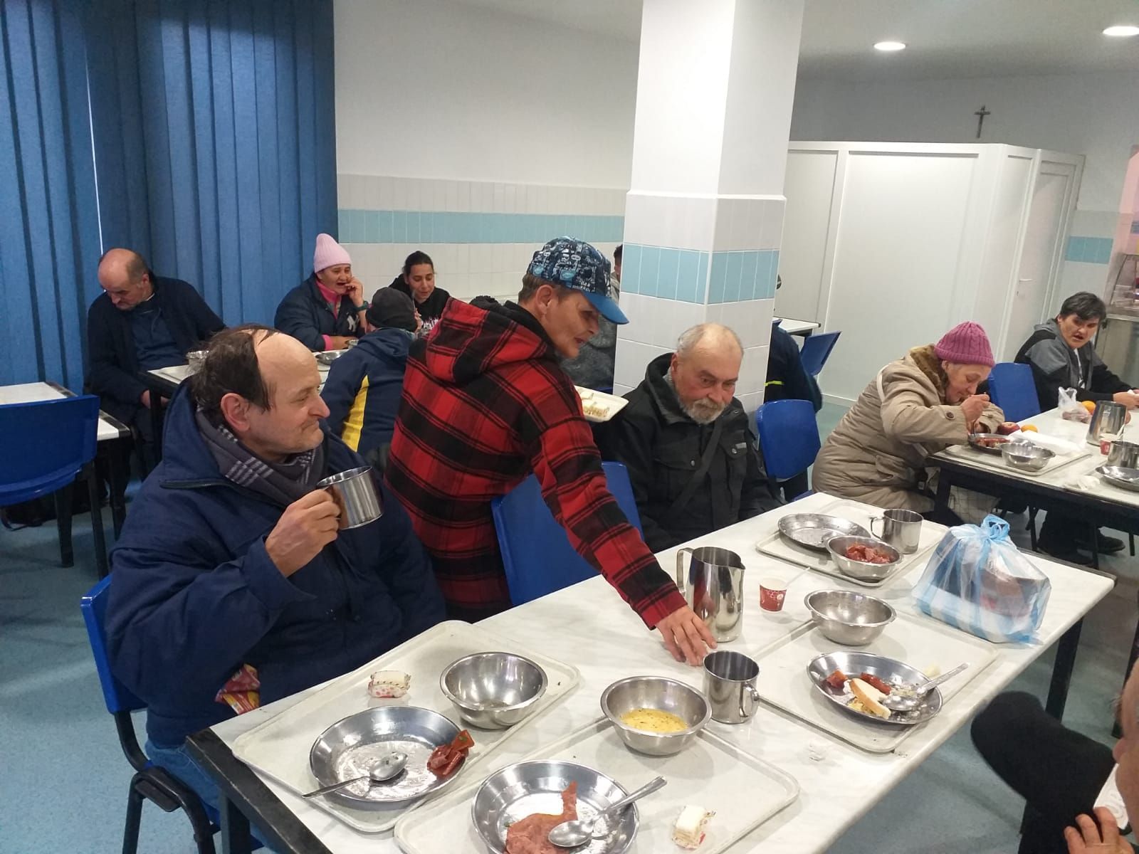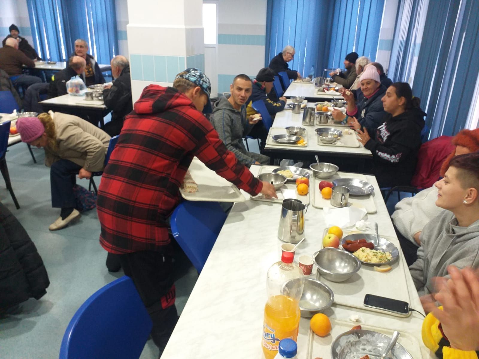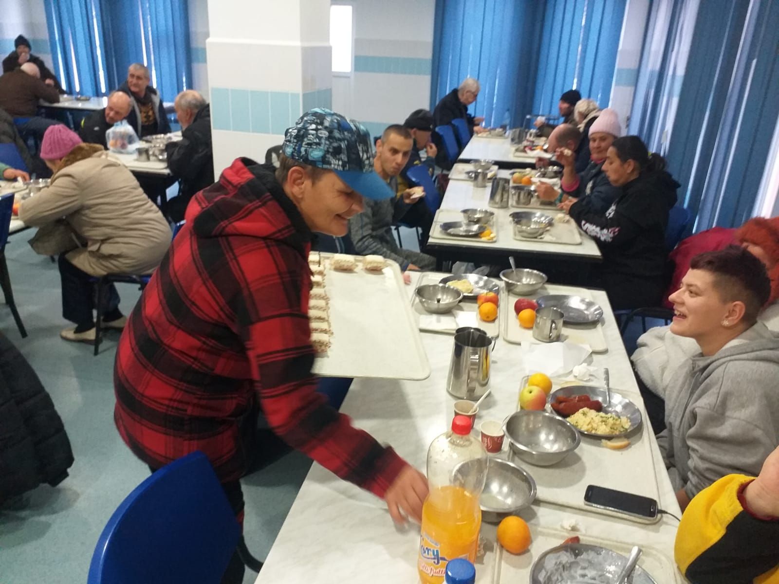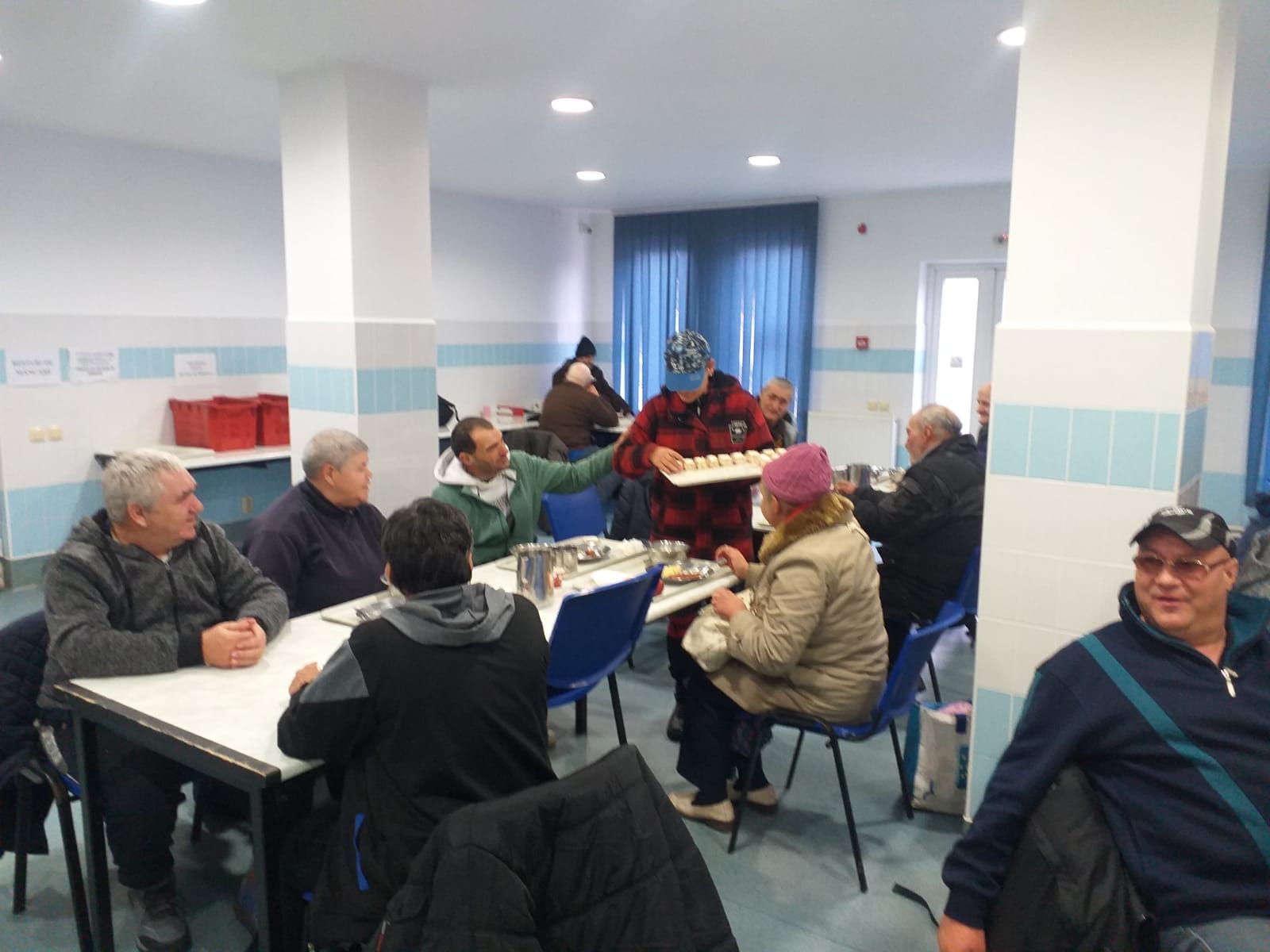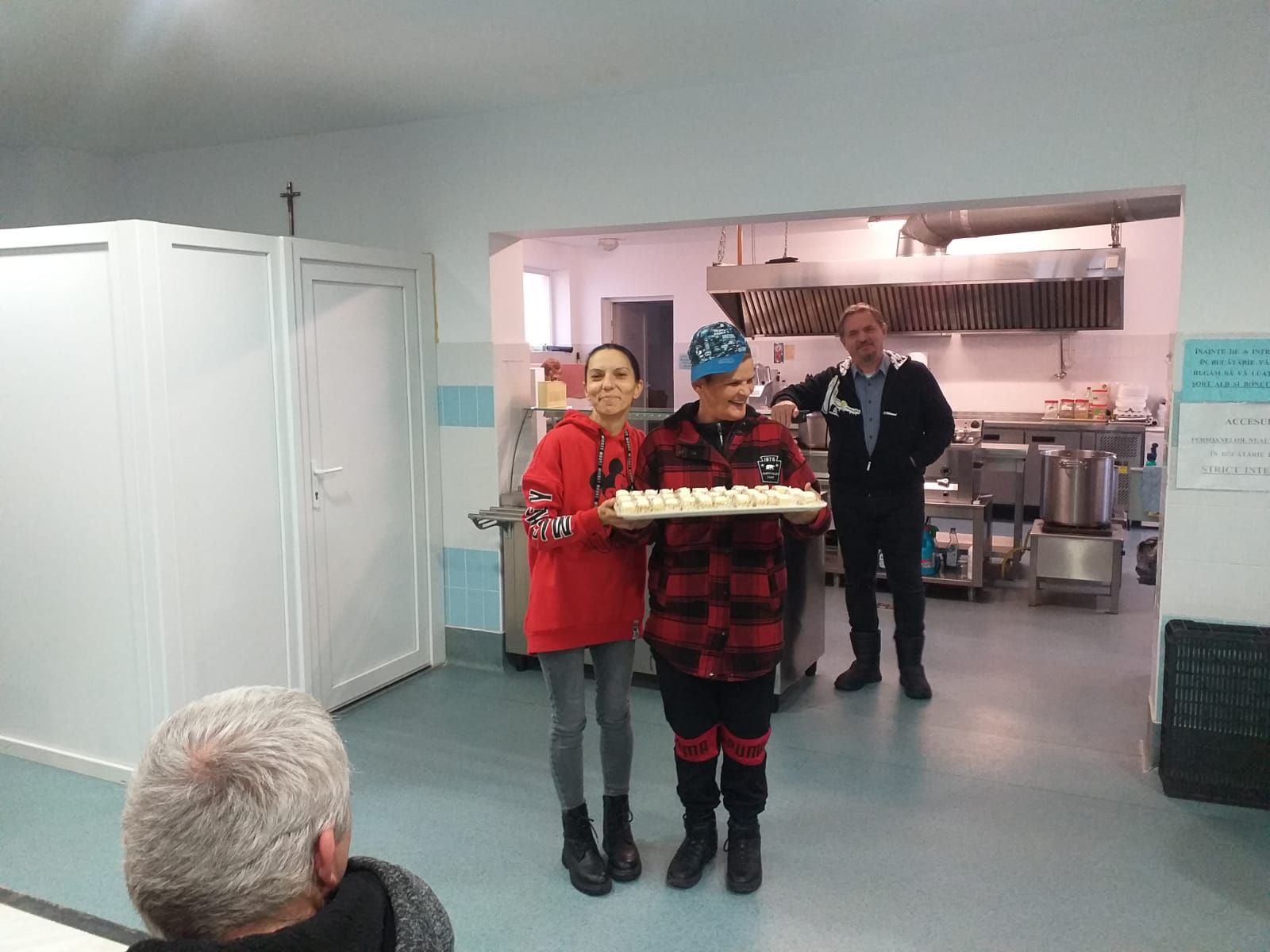 ne-a adus aniversarea unei beneficiare a serviciului social Cantina socială, astfel că am cântat urarea specifică momentului împreună cu ceilalți prezenți la masa de prânz. Beneficiari, voluntari, personalul cantinei, președintele Asociației Caritas Eparhial Oradea – cu toții ne-am bucurat pentru că am fost alături de aniversata lunii, cea care a și distribuit desertul beneficiarilor prezenți, pregătit în mod special pentru această zi.