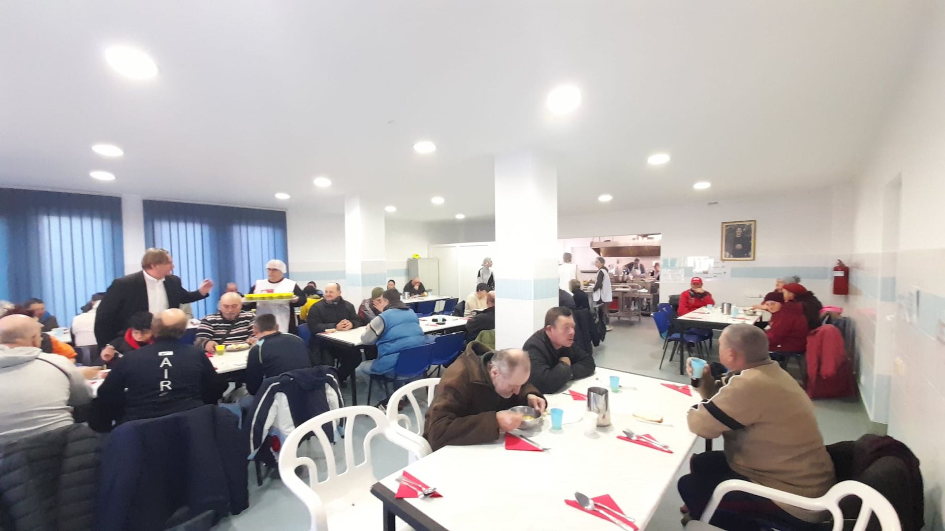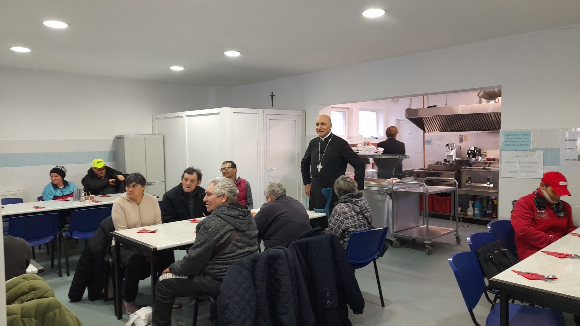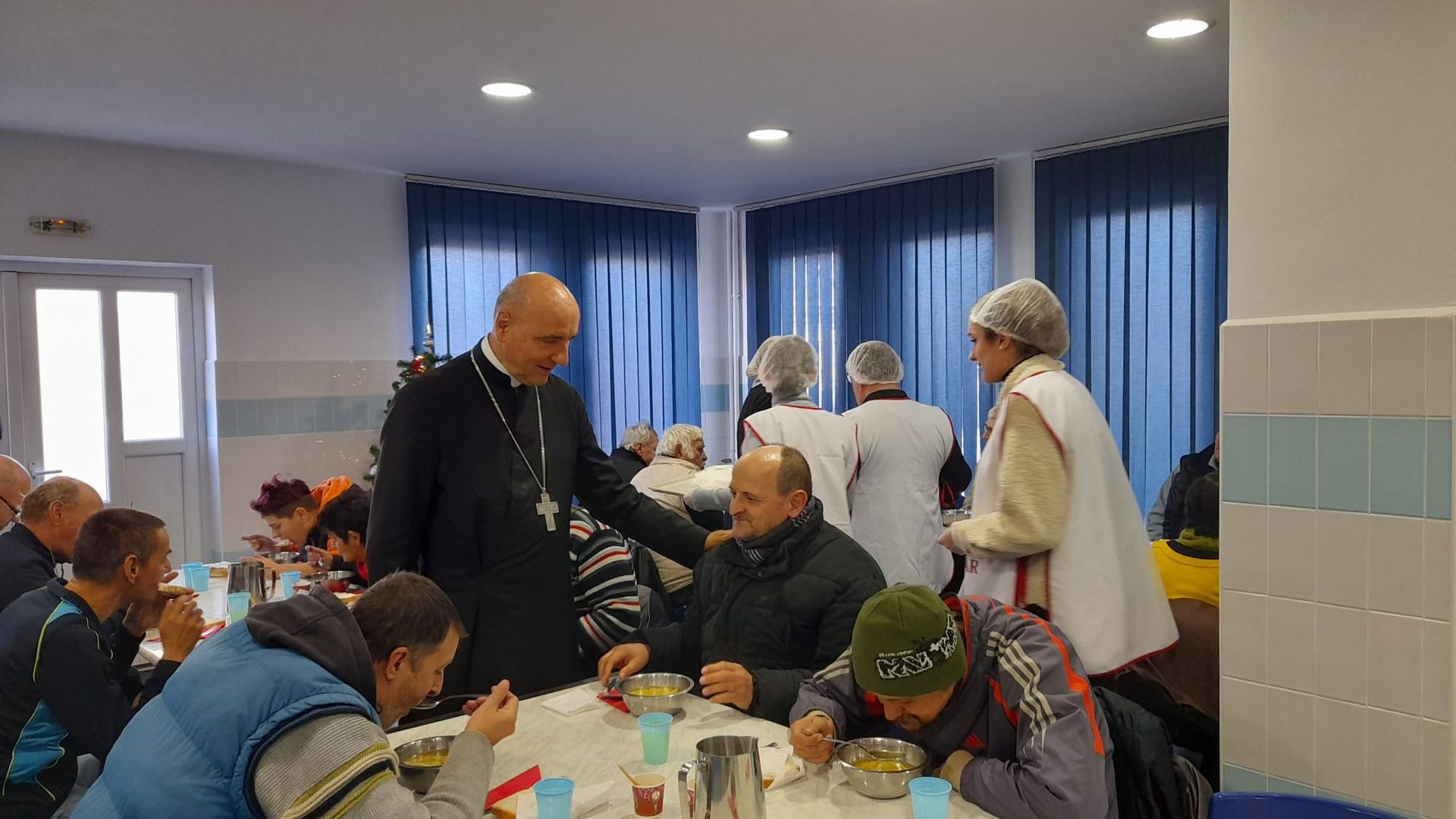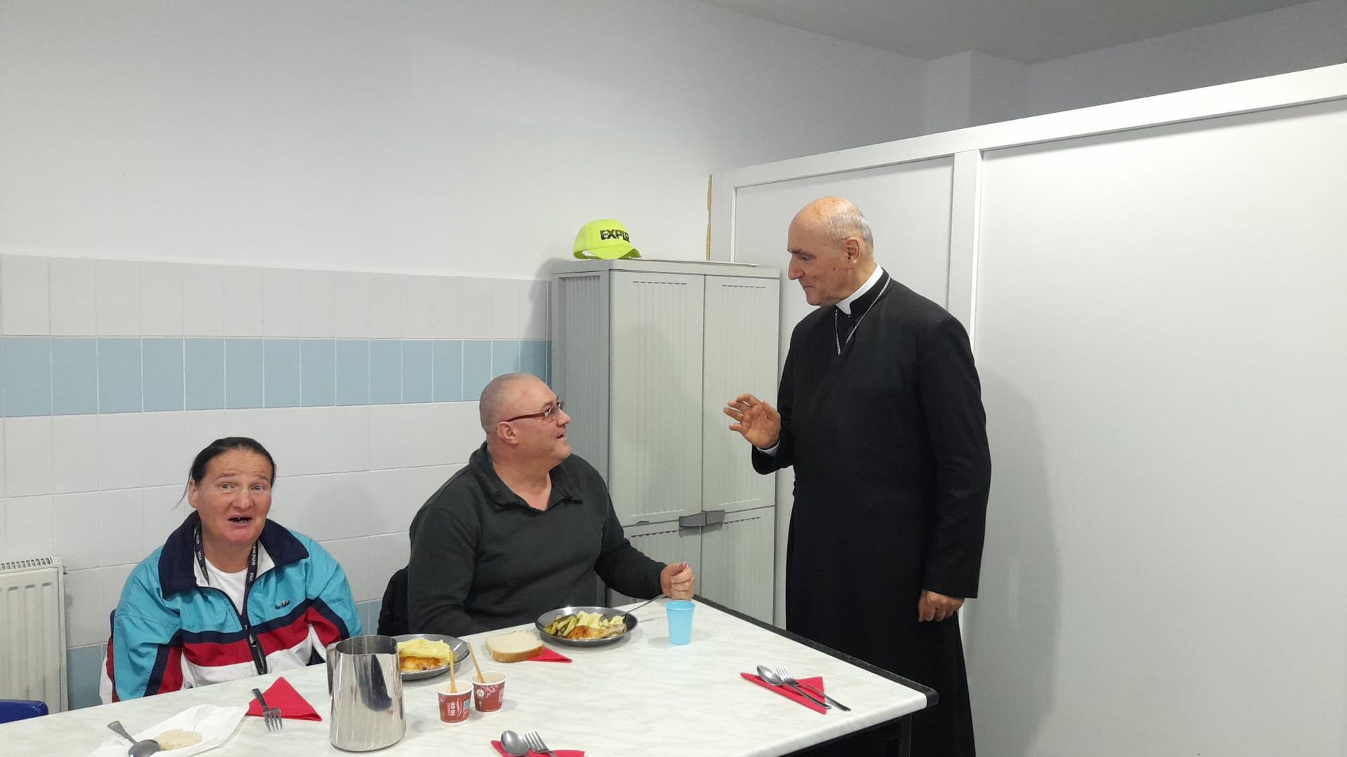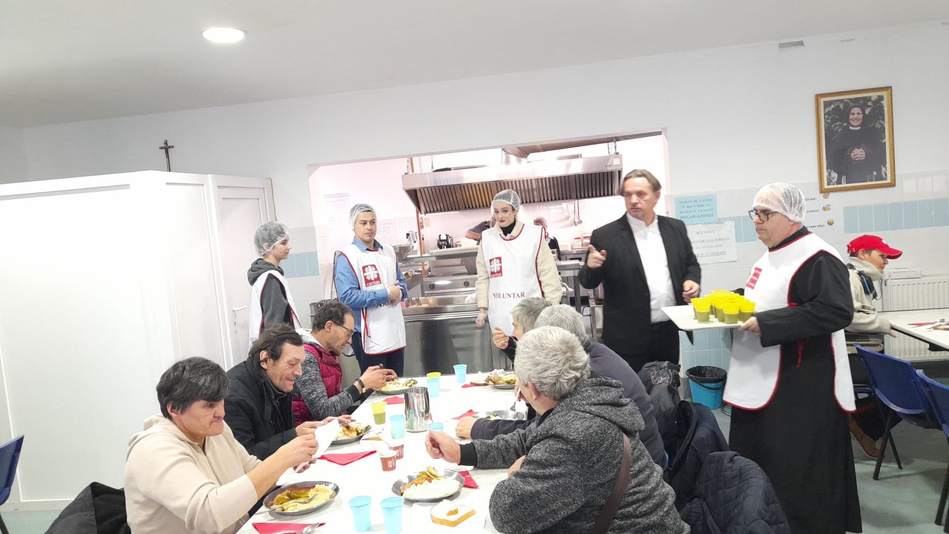Avându-i alături pe voluntarii însoțiți de coordonatorul lor, pe președintele asociației, pr. Todorean Olimpiu, pe una dintre practicantele care își face stagiul de practică la cantina socială, dar și pe oaspeții noștri: PSS Virgil Bercea, episcop greco-catolic al Eparhiei de Oradea, și secretarul Eugen Ivuț, am deschis ușa cantinei invitându-i pe toți cei care s-au adunat, cu nerăbdare, pentru masa de prânz.