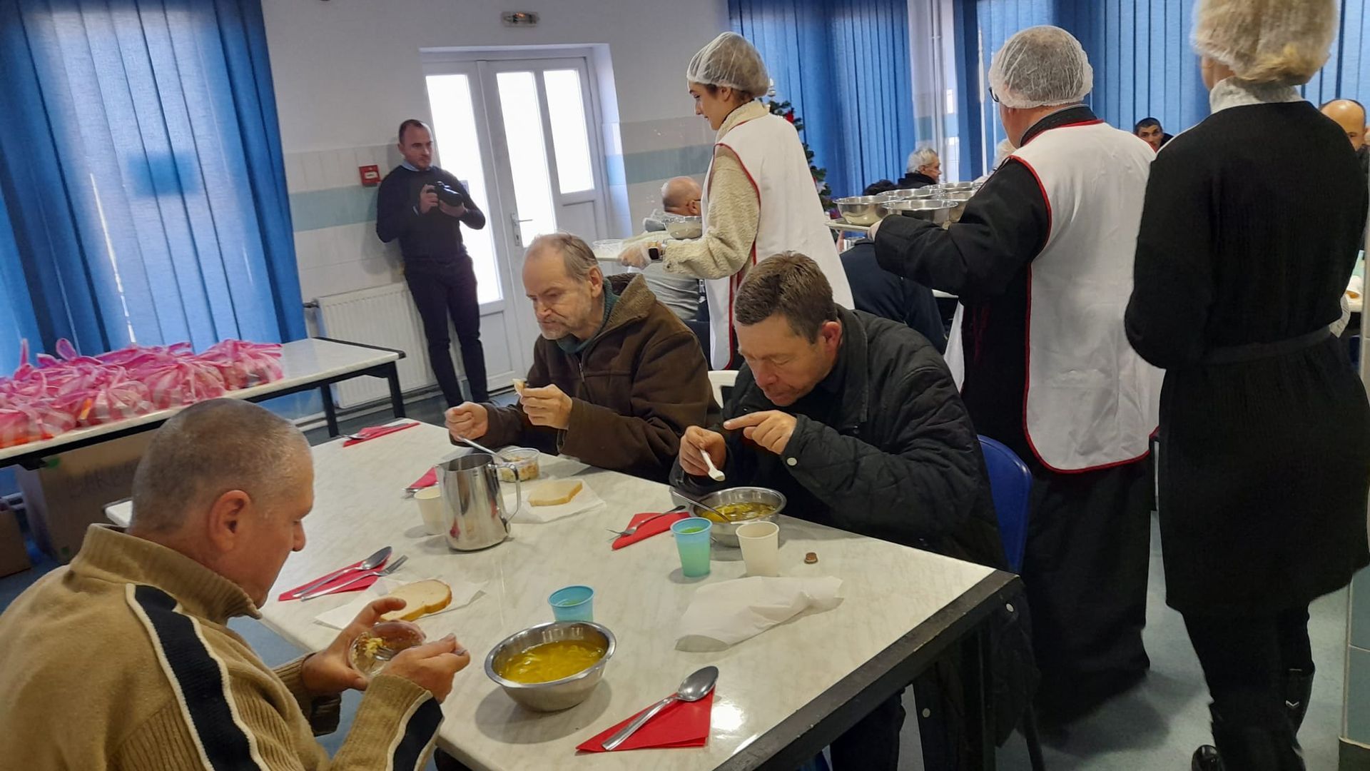 După binecuvântarea oferită de Preasfinția Sa, ne-am bucurat de meniul pregătit în bucătăria cantinei: salată boeuf, supă de tăiței, piure cu pulpă de pui și castraveți murați. Totodată, beneficiarii care au venit cu prieteni ai lor au fost serviți cu suc, cafea, vin și cozonac. Ca de fiecare dată la ceas de sărbătoare, voluntarii au servit la masă persoanele care au trecut azi pragul cantinei, fiind atenți la nevoile fiecăruia.