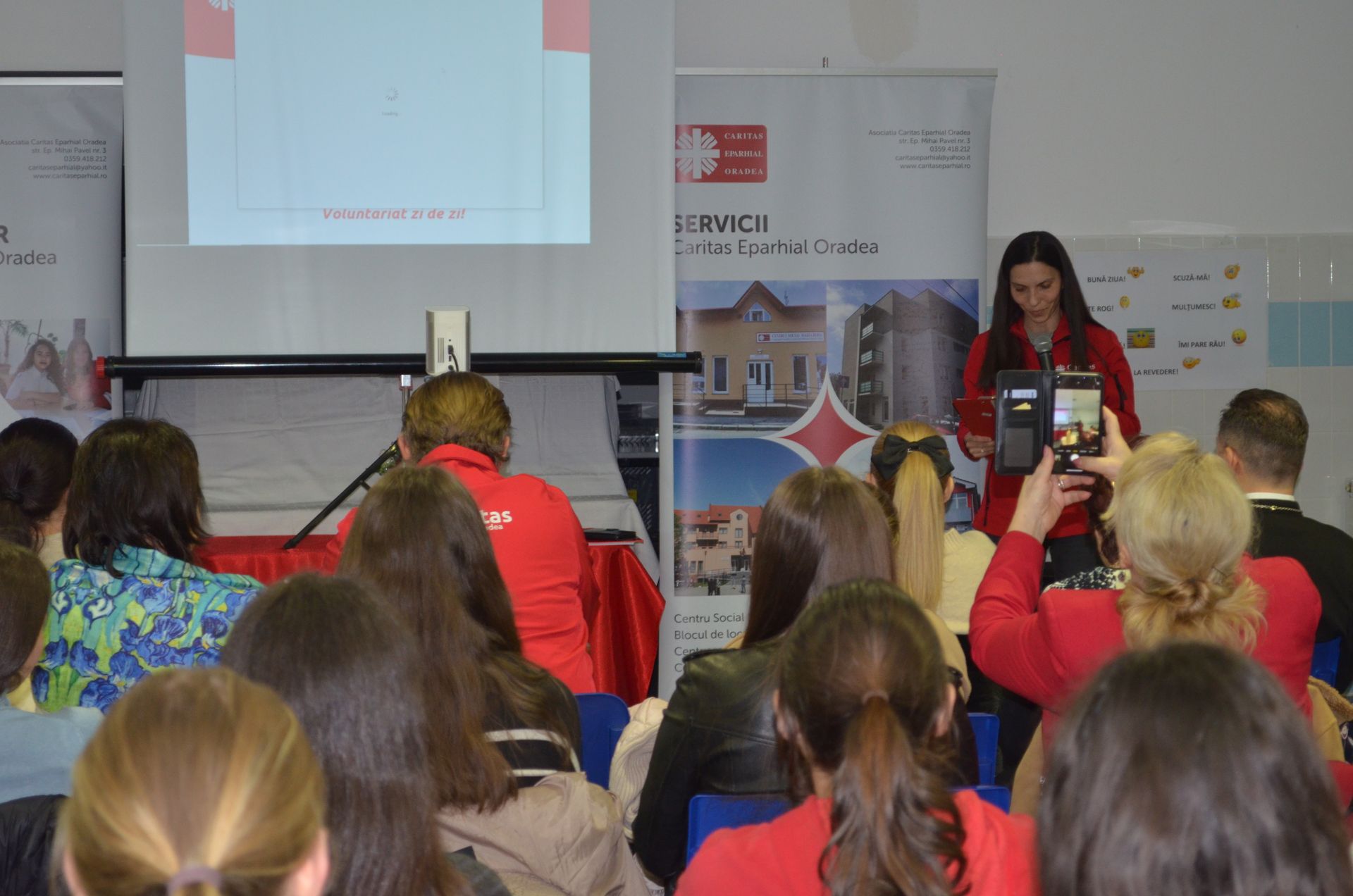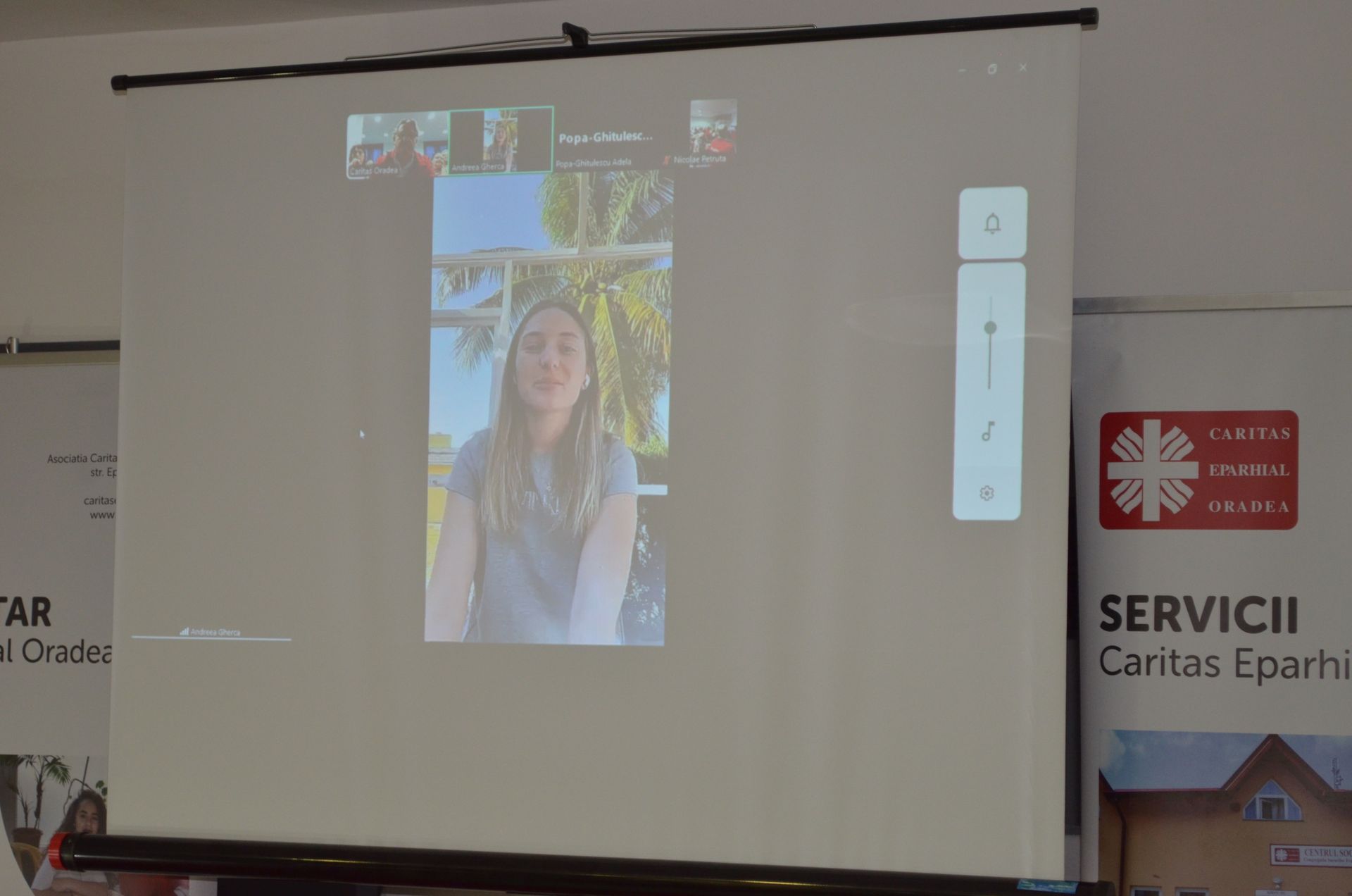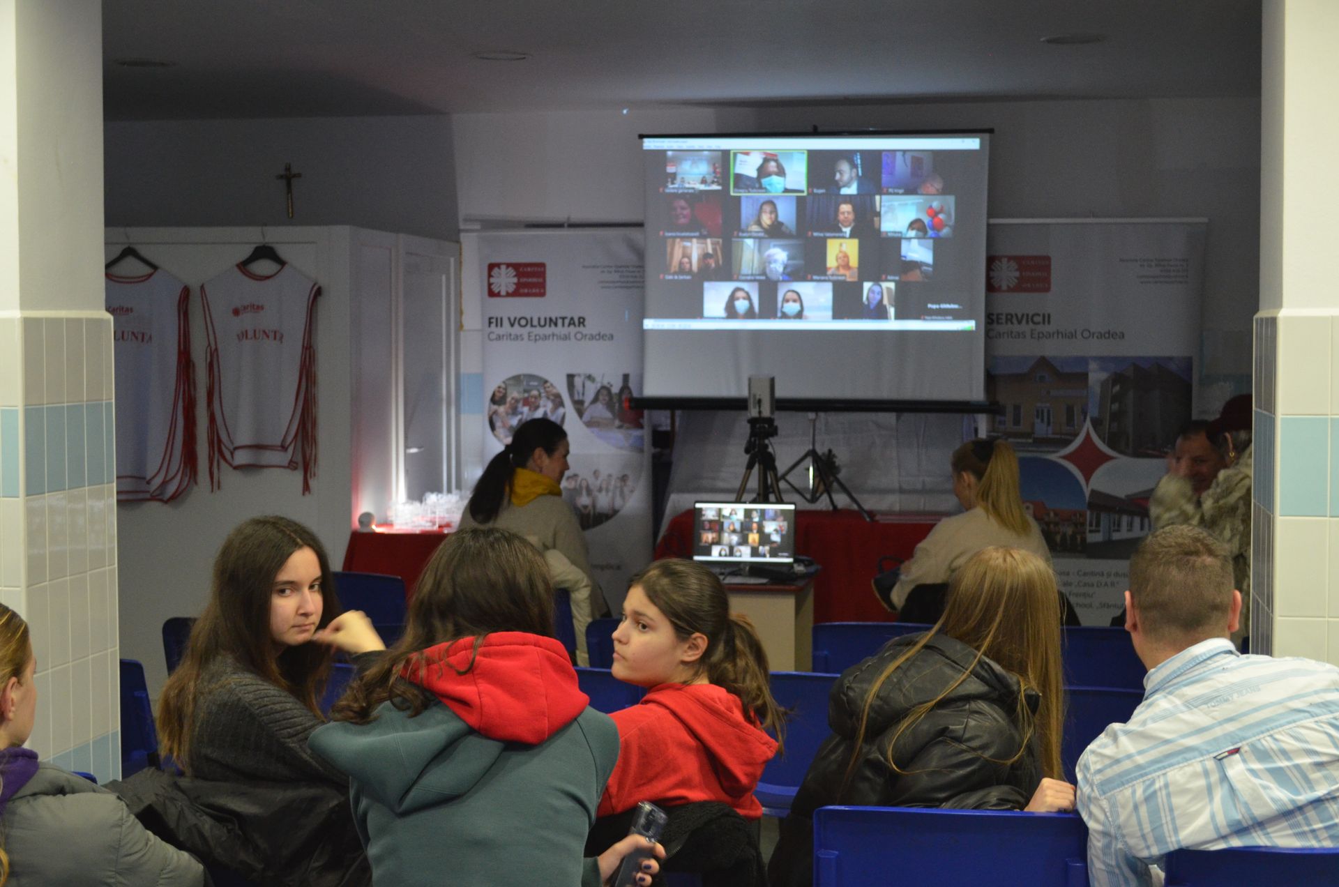 Au luat cuvântul: Andreea Ghercă, coordonator Departamentul de Voluntariat, (pe zoom), Anca Grama, director executiv al Direcției de Asistență Socială Oradea, Teodora Boda, asistent social principal al Asociației Caritas Eparhial Oradea și Părintele Mihai Vătămănelu, vicar general al Eparhiei Greco-Catolice de Oradea.