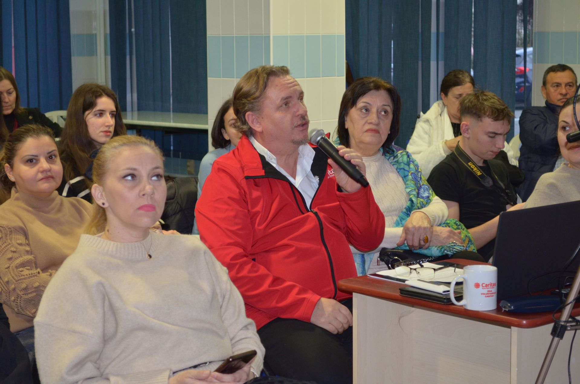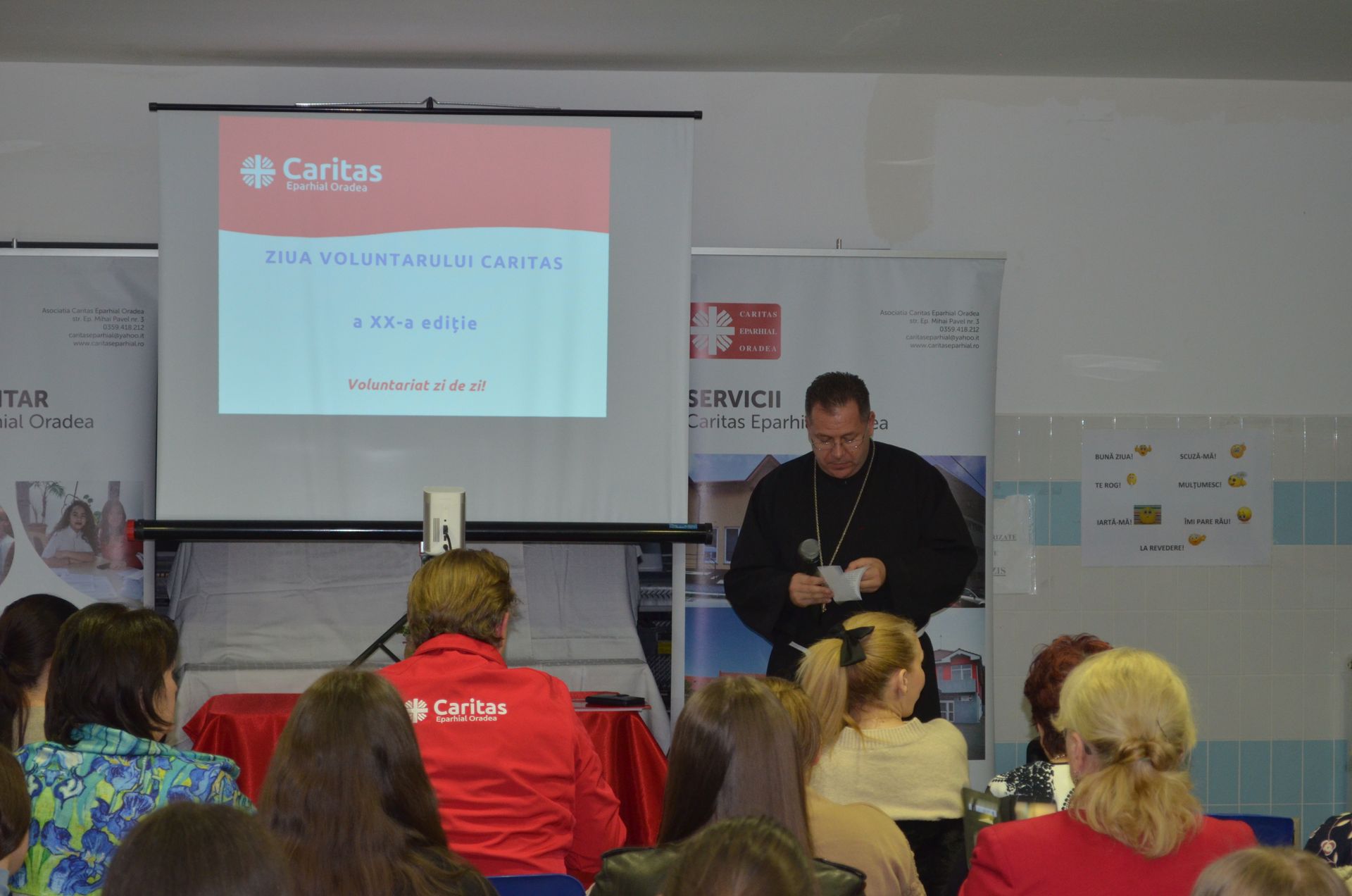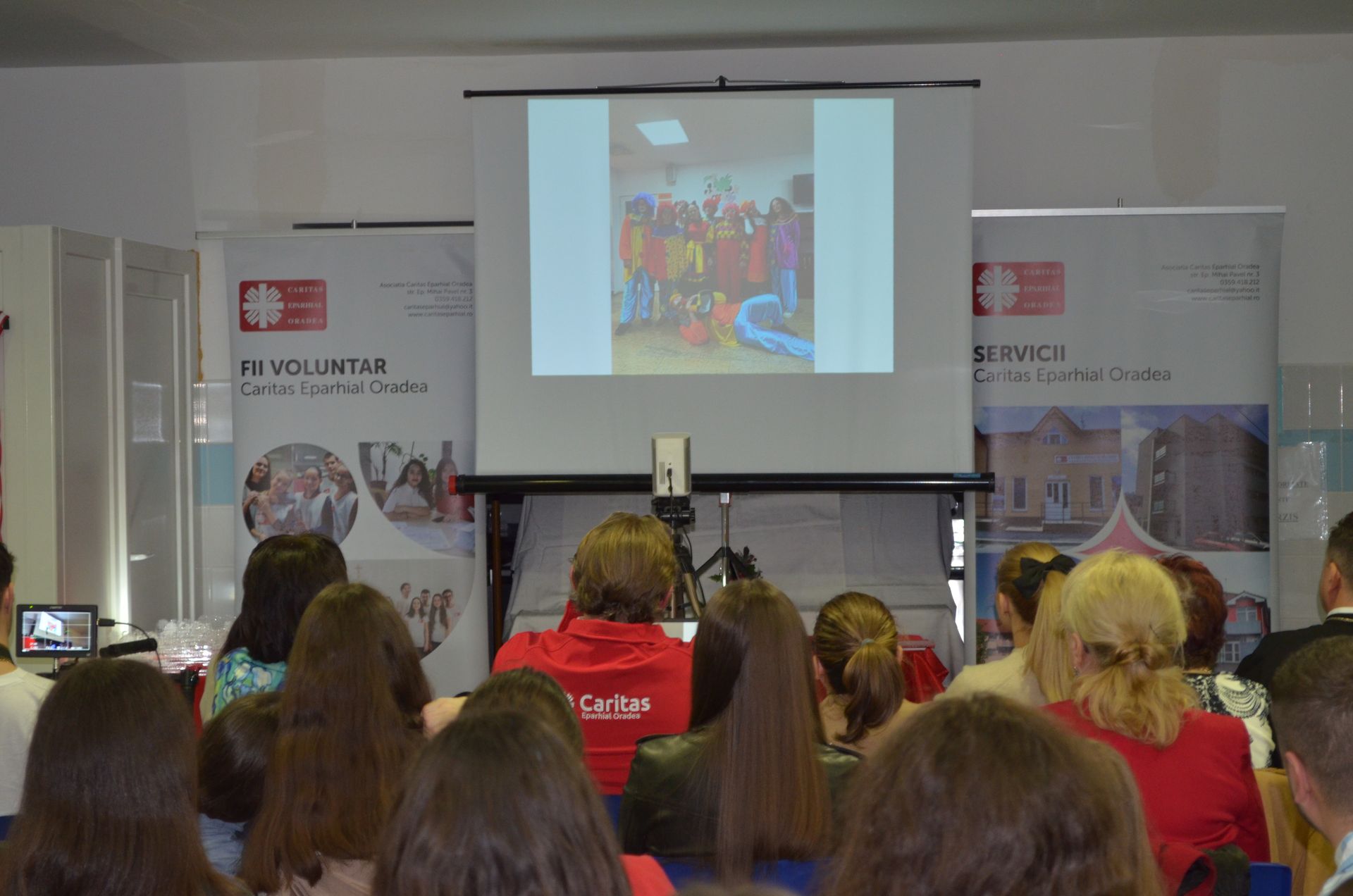 Au luat cuvântul: Andreea Ghercă, coordonator Departamentul de Voluntariat, (pe zoom), Anca Grama, director executiv al Direcției de Asistență Socială Oradea, Teodora Boda, asistent social principal al Asociației Caritas Eparhial Oradea și Părintele Mihai Vătămănelu, vicar general al Eparhiei Greco-Catolice de Oradea.