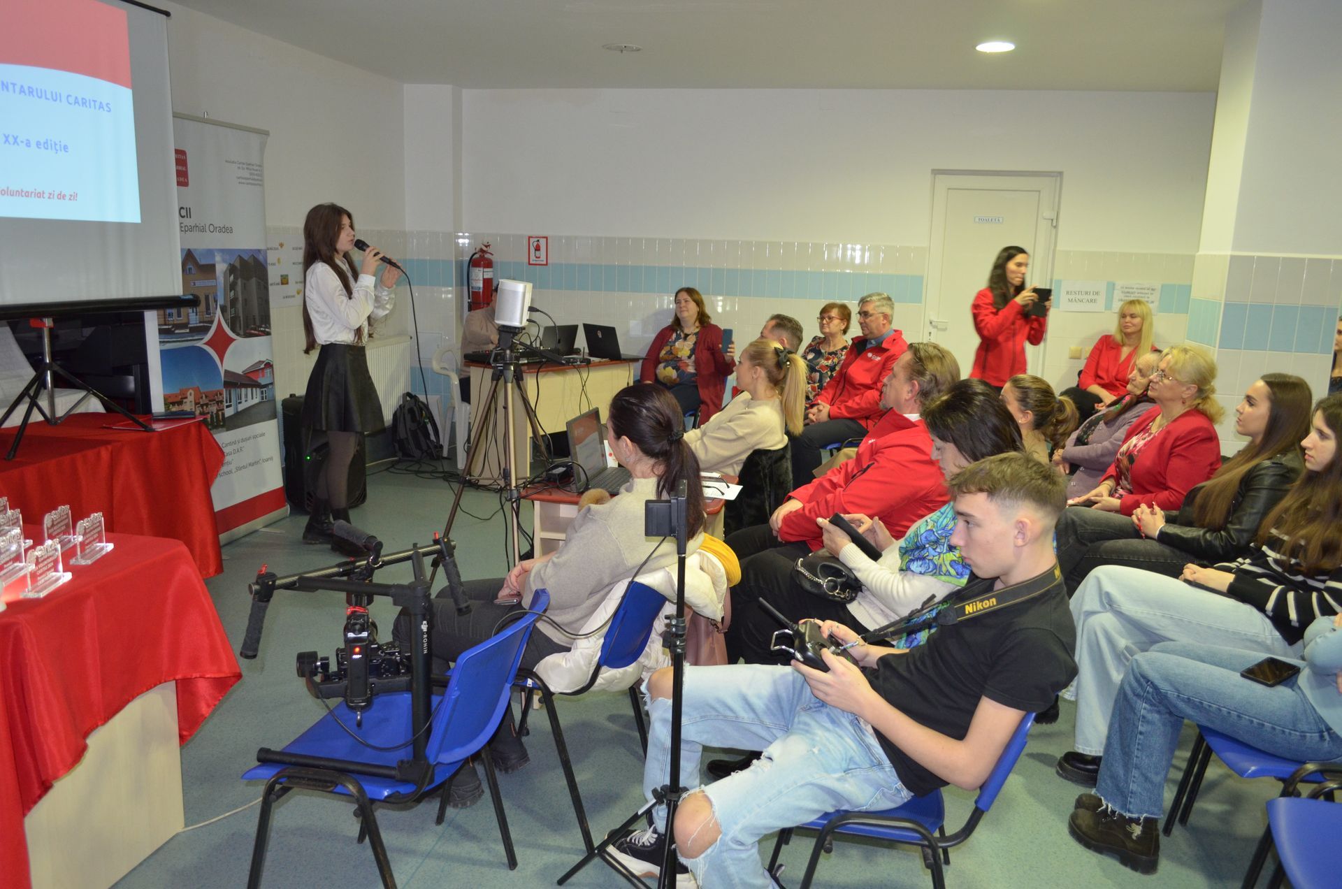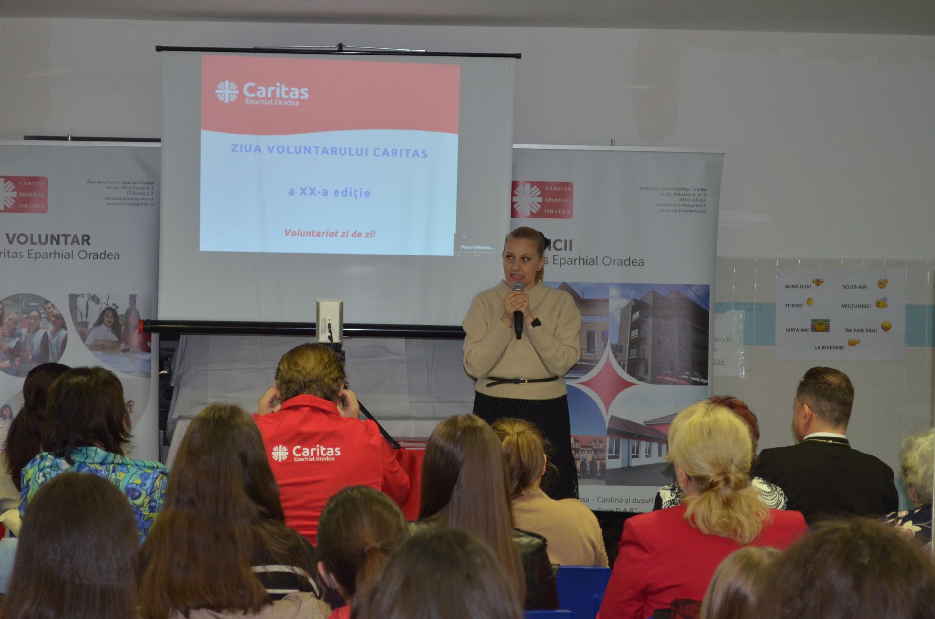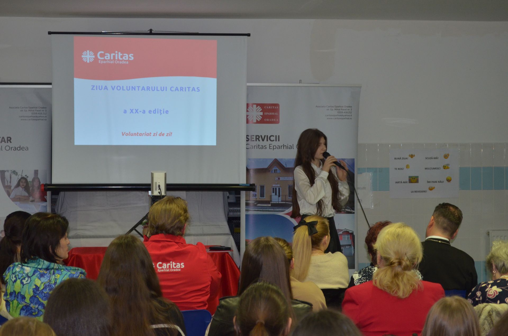 „Bună seara. În primul rând, vreau sa vă spun un mare mulțumesc pentru tot ceea ce ați făcut anul trecut, în activitățile programate cele uzuale, dar și în activitățile spontane și ați venit, pur și simplu cu dorința de a face ceva. În anul 2017, când am început voluntariatul la Caritas, nu mi-a trecut prin minte că o să ajung să fiu cea care, într-o bună zi, să coordonez voluntarii Caritas. Încă de pe atunci Ziua Voluntarului era un eveniment important pentru mine, plin de emoții, ca voluntar și, acum, la fel, ca și coordonator al vostru. Pentru mine Caritas Eparhial este unul dintre locurile în care pot spune că m-am simțit ca acasă. Aici am cunoscut multe persoane, am făcute multe prietenii, m-am dezvoltat, și datorită vouă, voluntarilor, care mi-ați fost aproape. Mi s-a îndeplinit dorința și vă mulțumesc pentru tot ceea ce ați făcut pentru mine și pentru asociație! (Andreea Ghercă, coordonator Departamentul de Voluntariat).