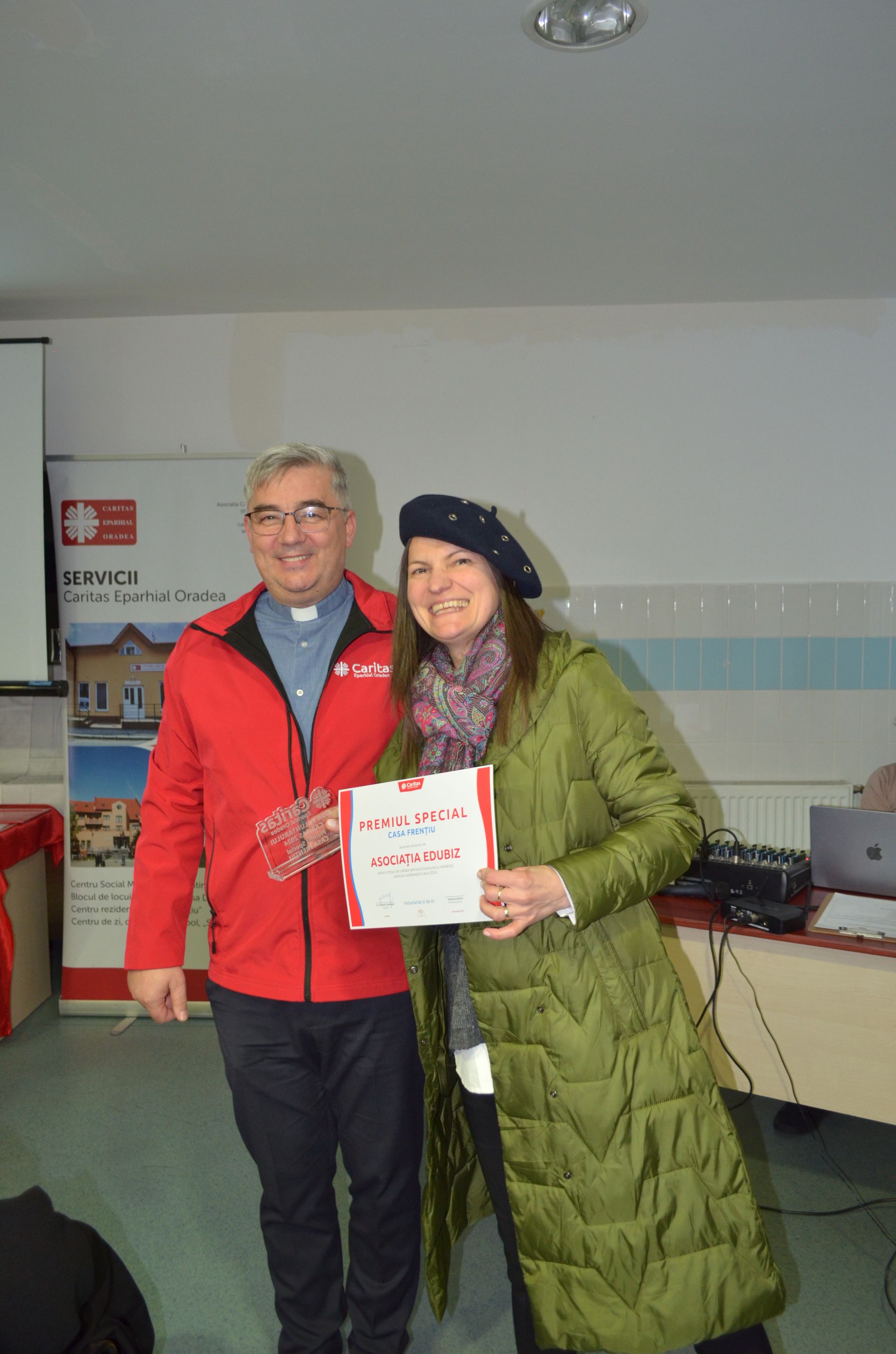 Acest premiu îl oferim pentru încurajarea și facilitarea angajaților de a se implica în activitatea cantinei sociale. În anul 2024, o companie din Oradea s-a remarcat prin implicarea a 13 angajați care au acumulat un număr de 52 de ore de voluntariat. Curățenia în sala de mese și în bucătăria cantinei sociale au fost activitățile principale, dar au ajutat și la distribuirea mesei de prânz, oferind beneficiarilor prezenți mâncarea proaspătă și caldă. Le mulțumim pentru implicare!