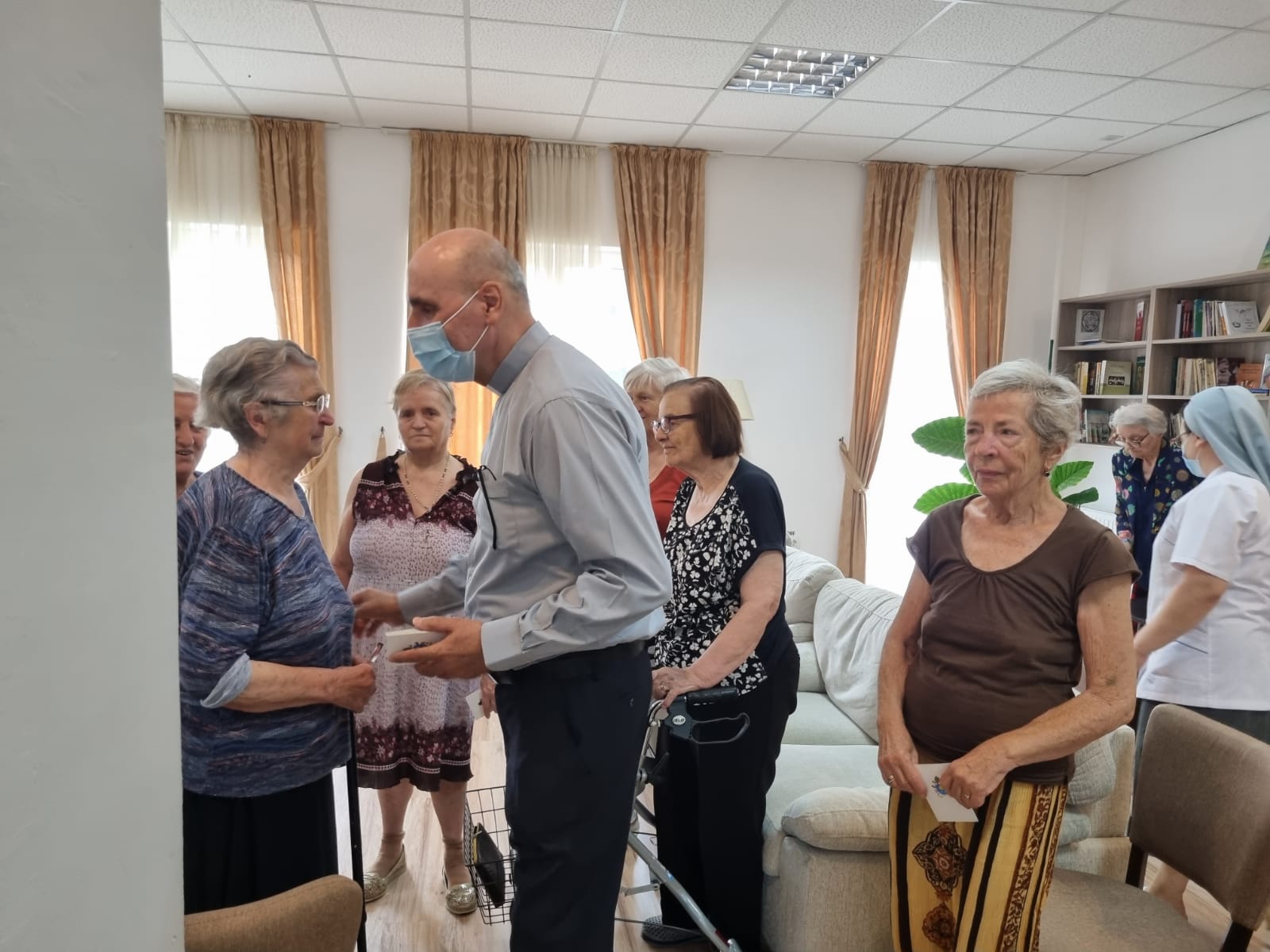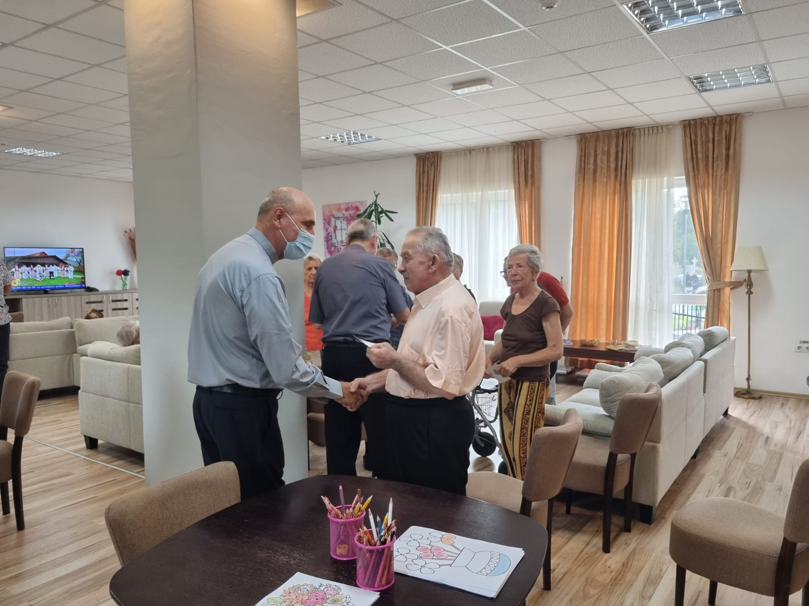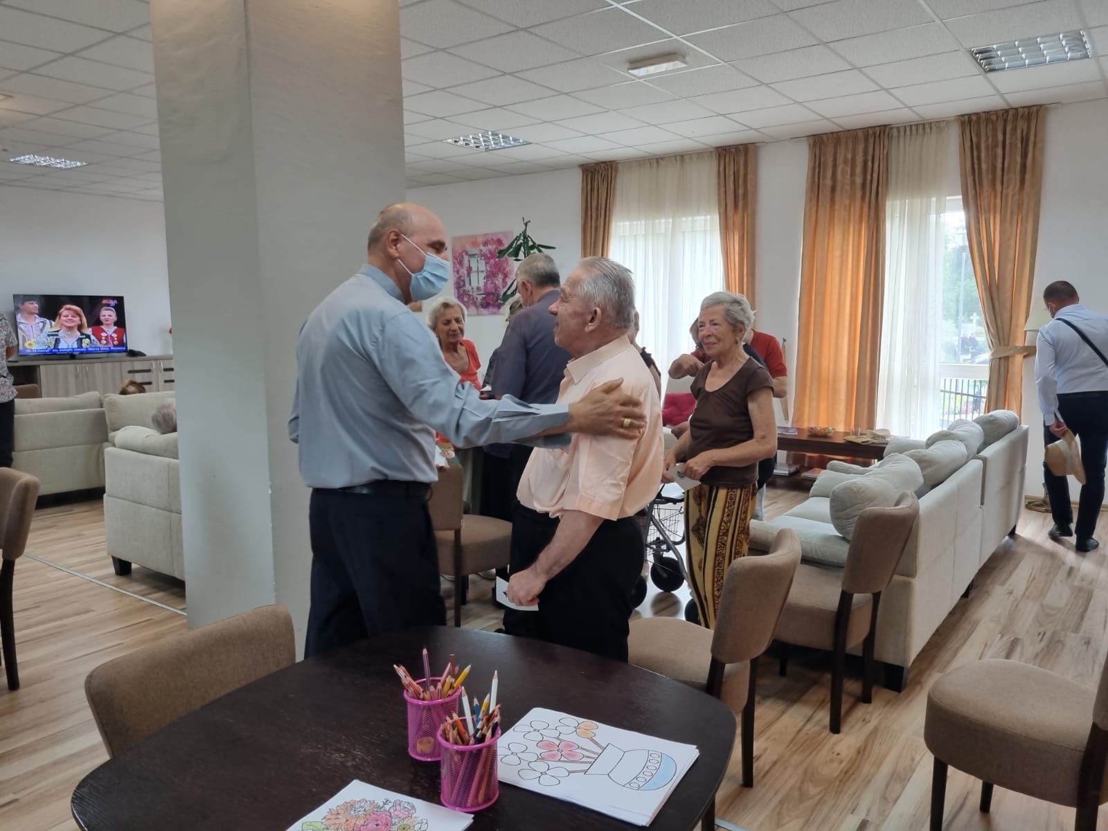 După prezentarea făcută de doamna Miruna Moza, coordonatorul Centrului, oaspeții au petrecut câteva momente în living, alături de seniorii noștri. Toți rezidenții au primit din partea oaspeților câte o iconiță, întâlnirea încheindu-se cu o rugăciune.
