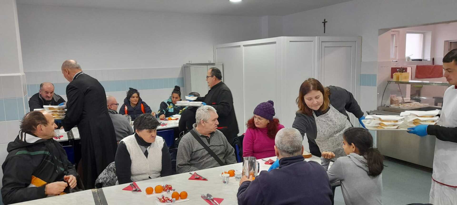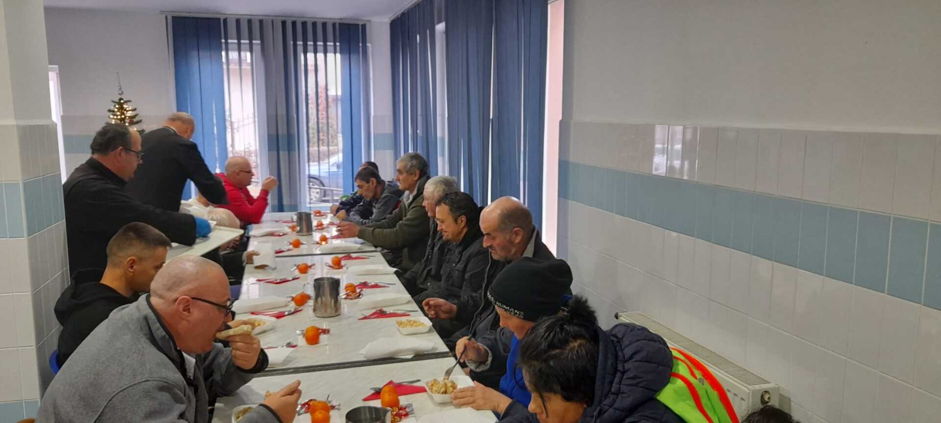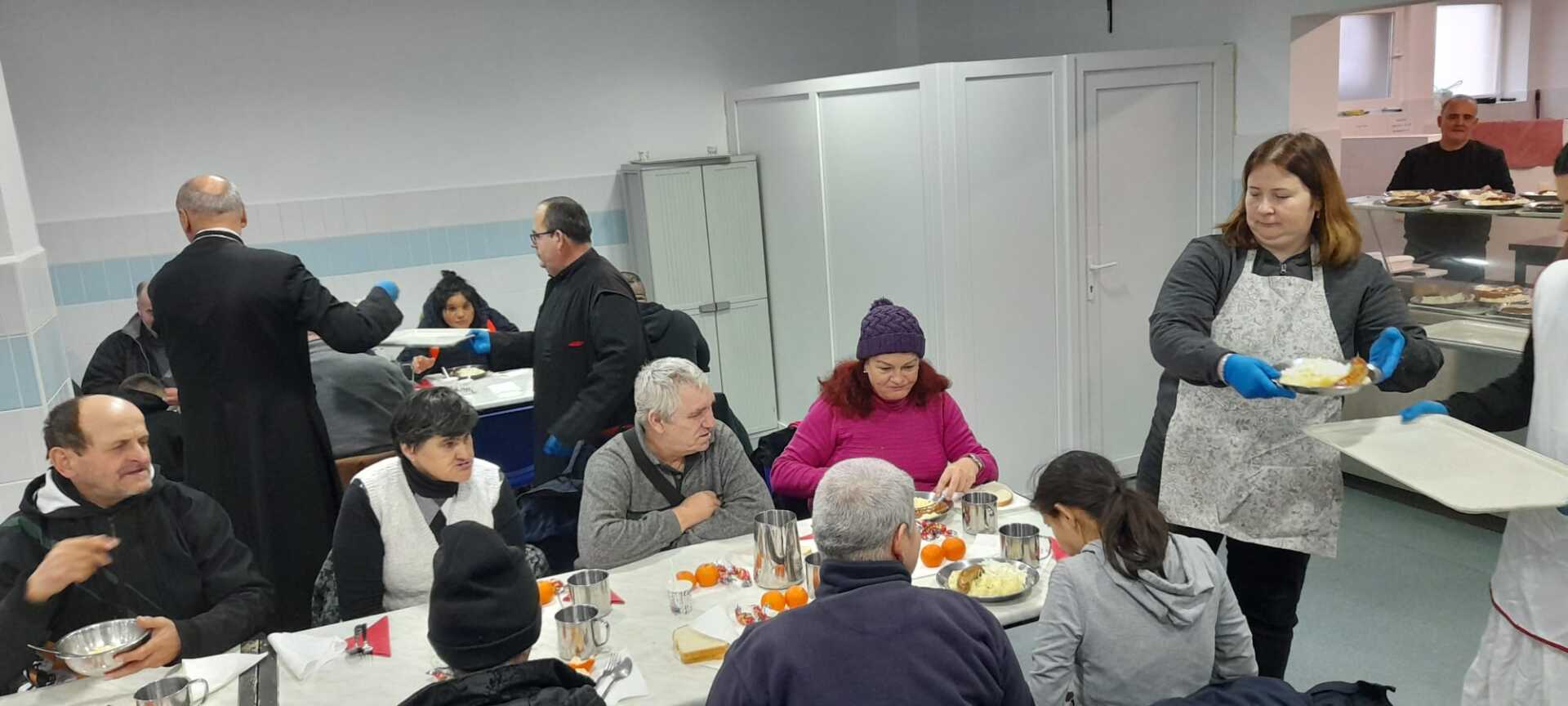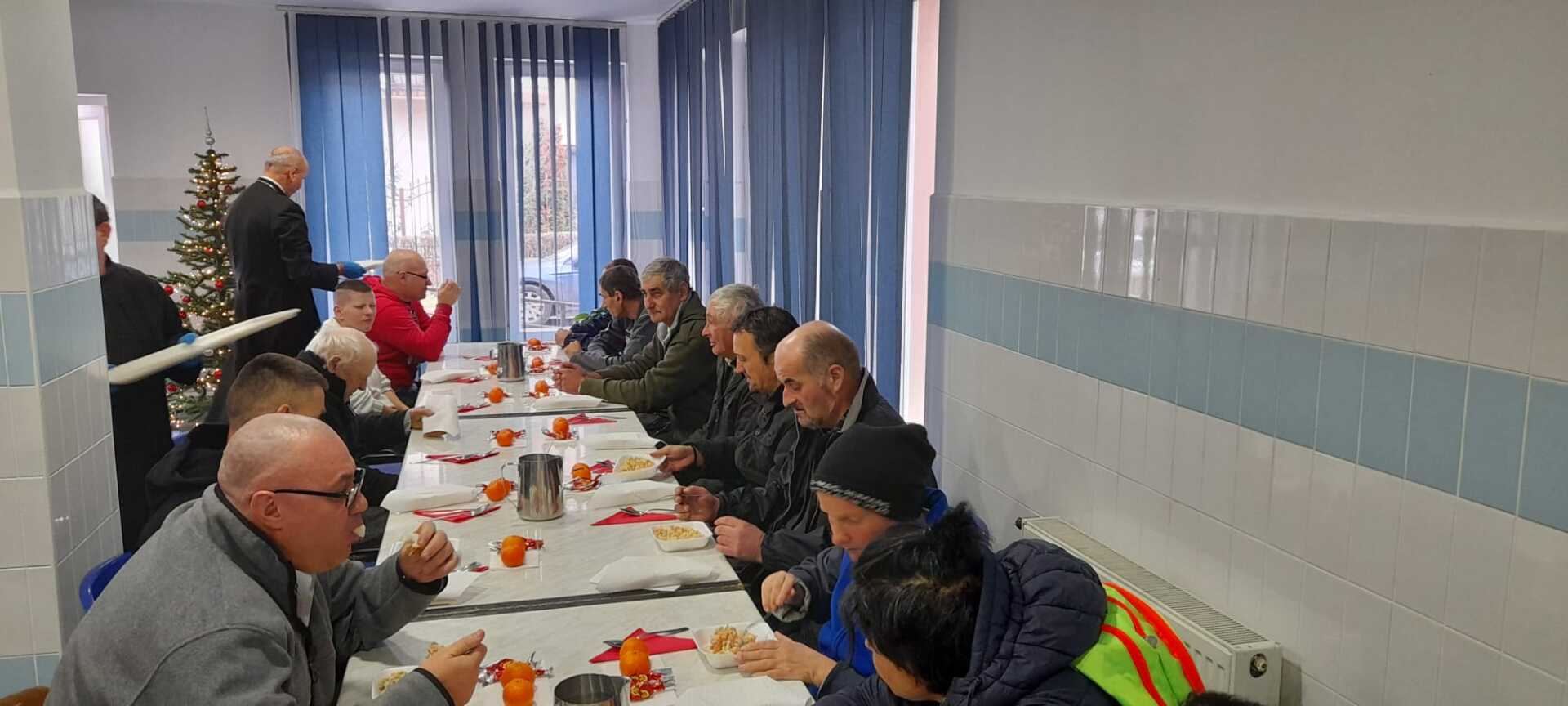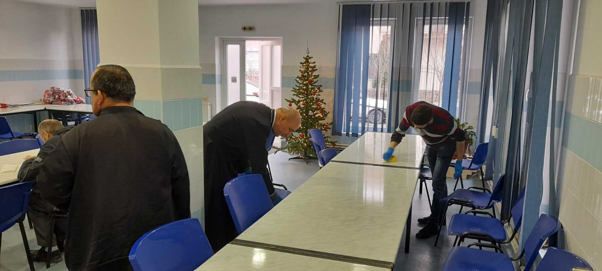 Un moment aparte în viața de zi cu zi a beneficiarilor cantinei sociale este evenimentul care a avut loc astăzi, 22 decembrie a.c., la cantina socială. Sărbătorind, în avans, Nașterea Mântuitorului, am avut oaspeți de seamă la cantină, iar conducerea Asociației Caritas Eparhial a pus umărul lângă cel al voluntarilor prezenți la pregătirea sălii de mese, la servirea beneficiarilor pe toată durata prânzului, precum și la curățenia din sala de mese.