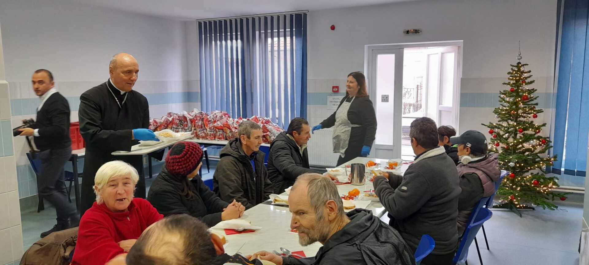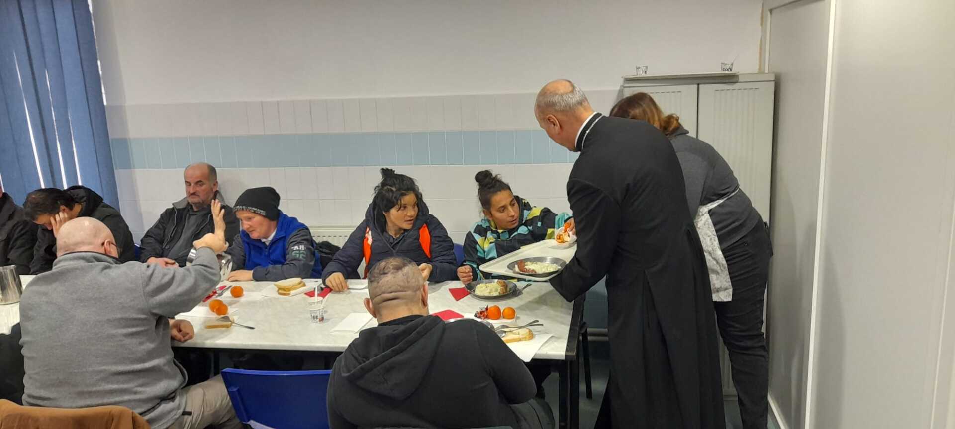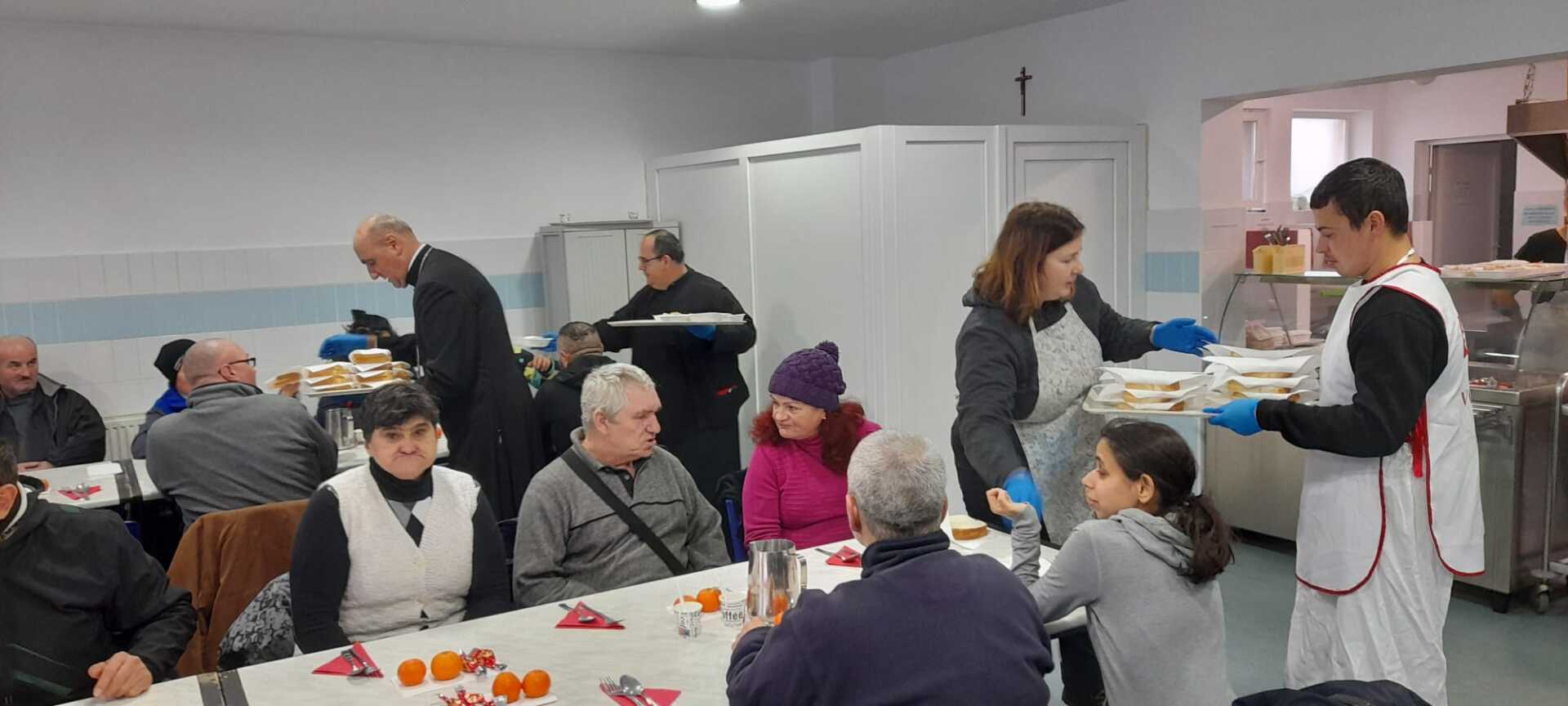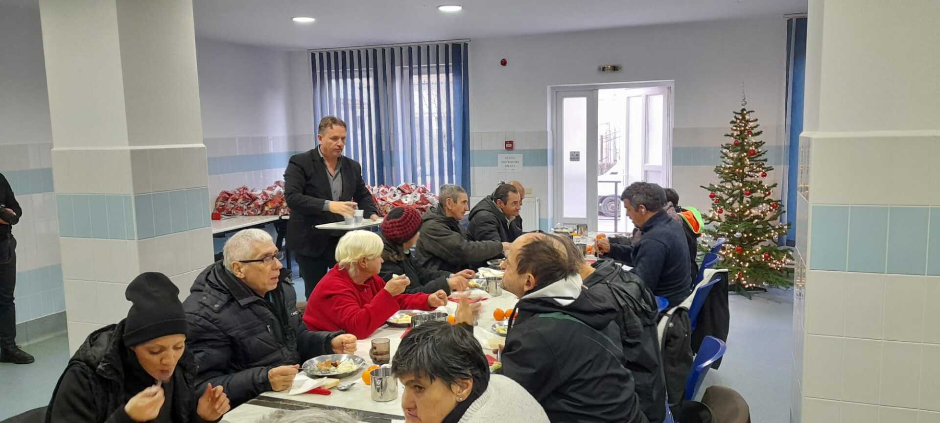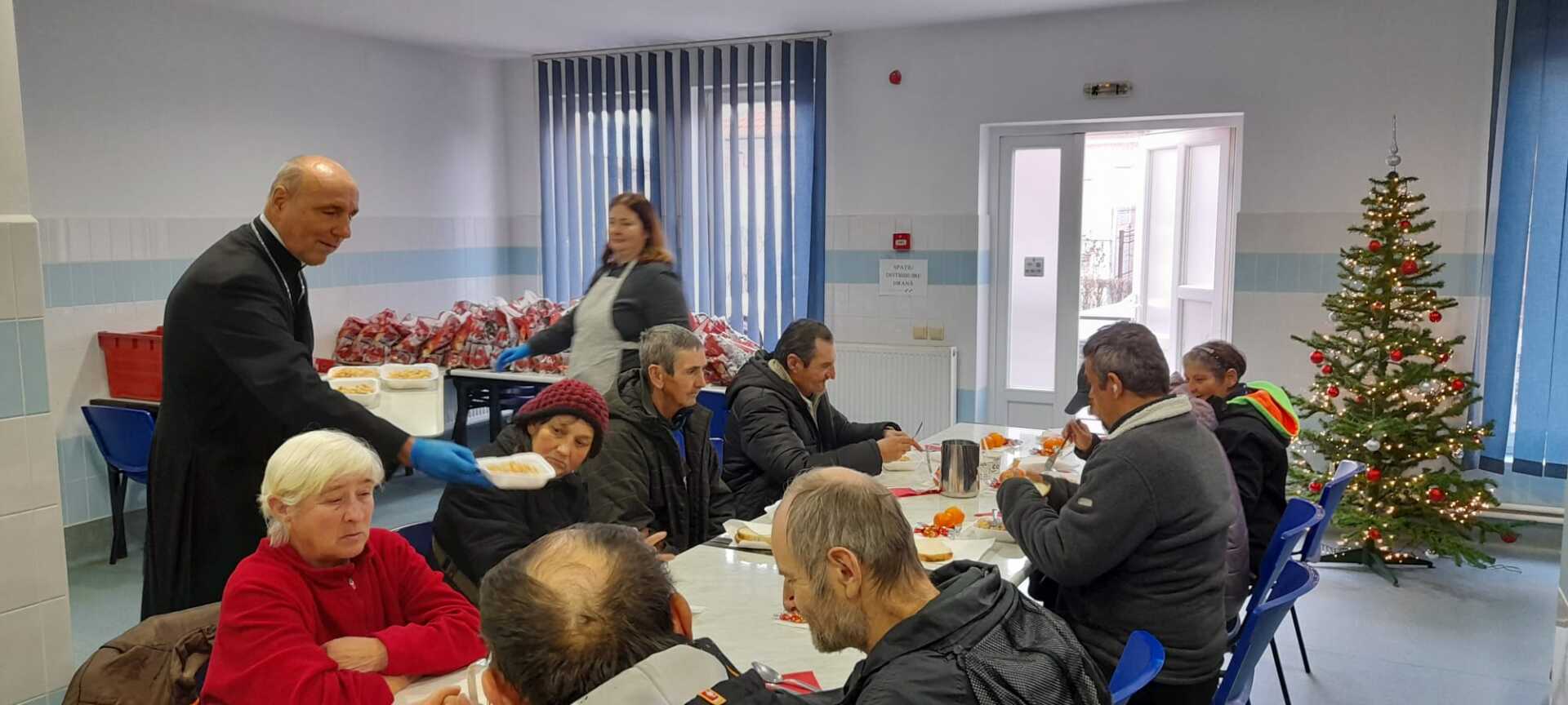 Un moment aparte în viața de zi cu zi a beneficiarilor cantinei sociale este evenimentul care a avut loc astăzi, 22 decembrie a.c., la cantina socială. Sărbătorind, în avans, Nașterea Mântuitorului, am avut oaspeți de seamă la cantină, iar conducerea Asociației Caritas Eparhial a pus umărul lângă cel al voluntarilor prezenți la pregătirea sălii de mese, la servirea beneficiarilor pe toată durata prânzului, precum și la curățenia din sala de mese.