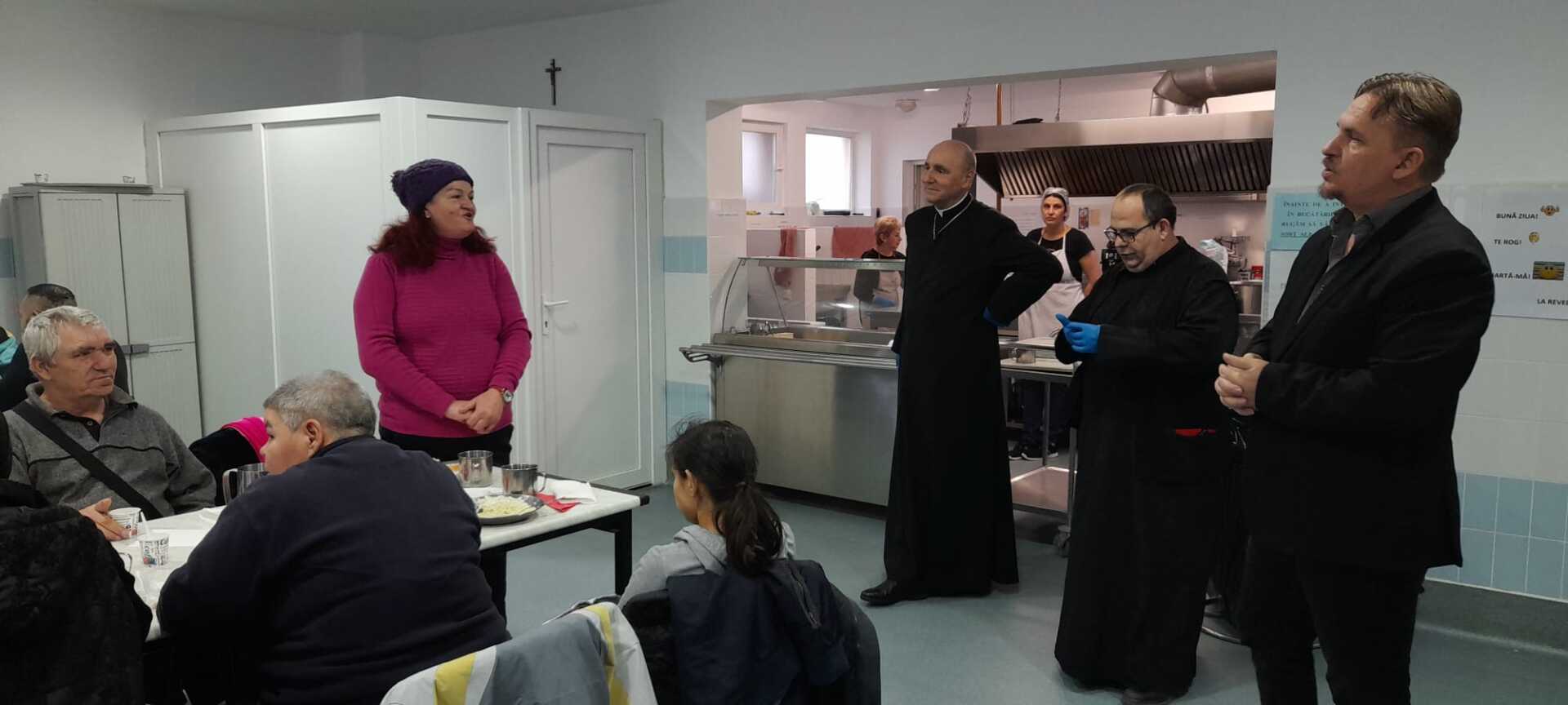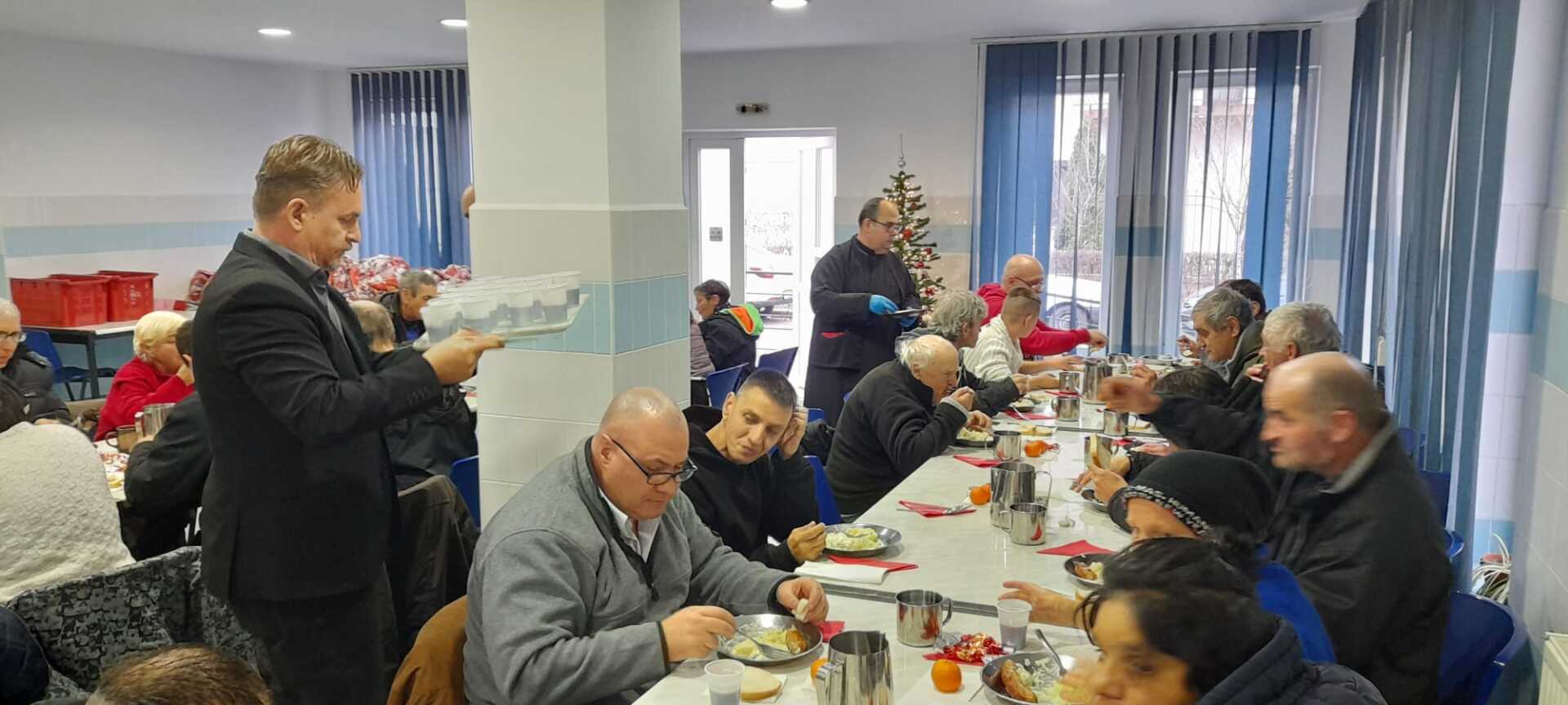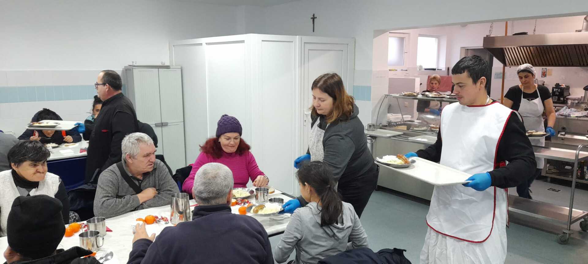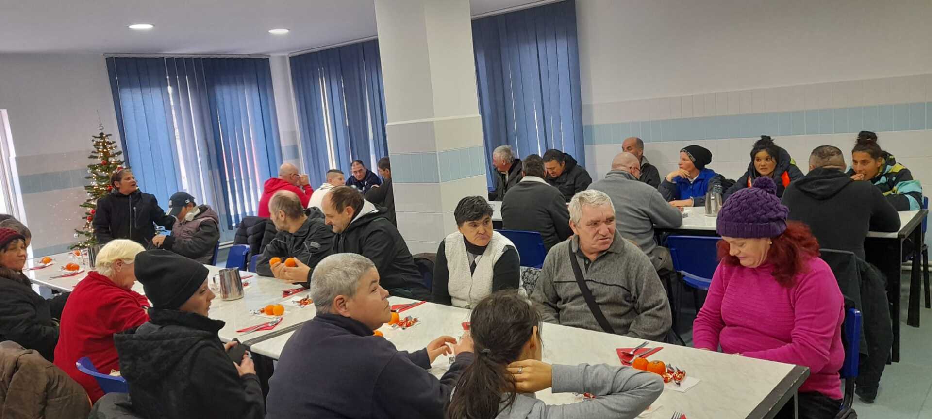 Un moment aparte în viața de zi cu zi a beneficiarilor cantinei sociale este evenimentul care a avut loc astăzi, 22 decembrie a.c., la cantina socială. Sărbătorind, în avans, Nașterea Mântuitorului, am avut oaspeți de seamă la cantină, iar conducerea Asociației Caritas Eparhial a pus umărul lângă cel al voluntarilor prezenți la pregătirea sălii de mese, la servirea beneficiarilor pe toată durata prânzului, precum și la curățenia din sala de mese.