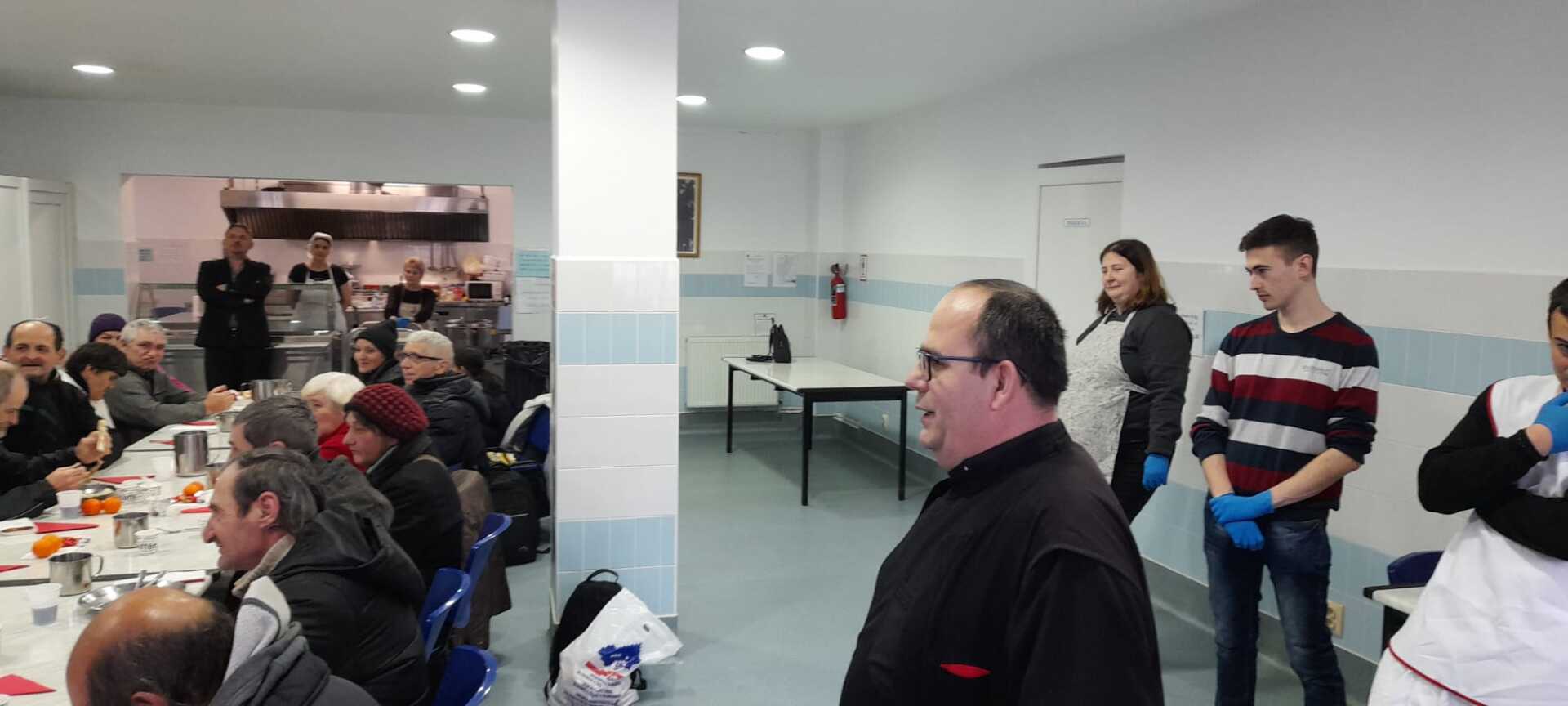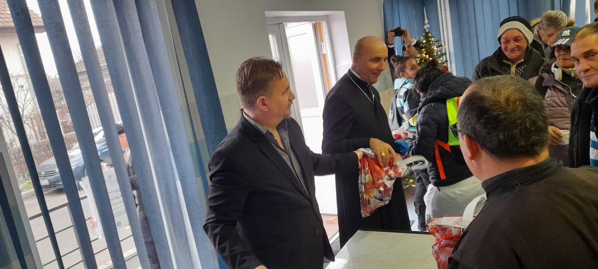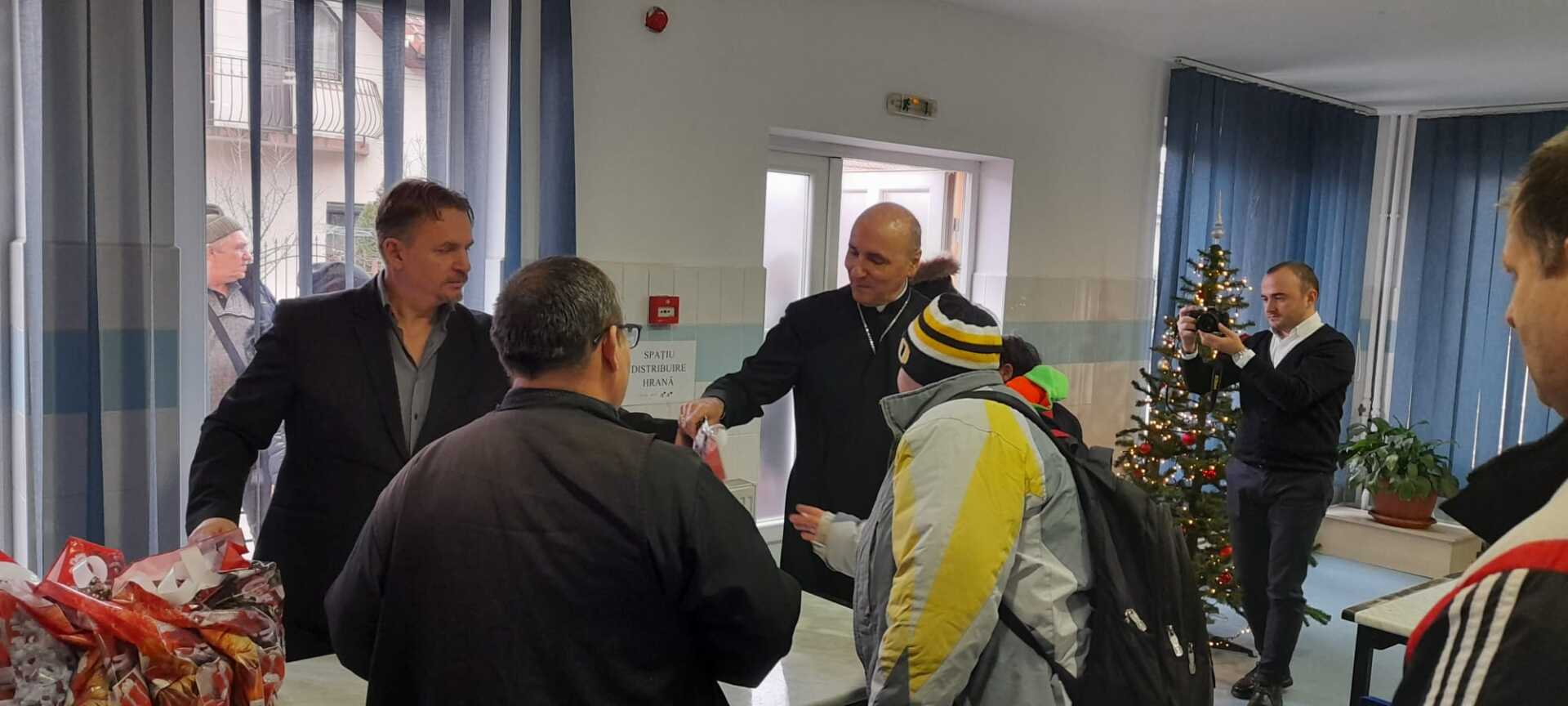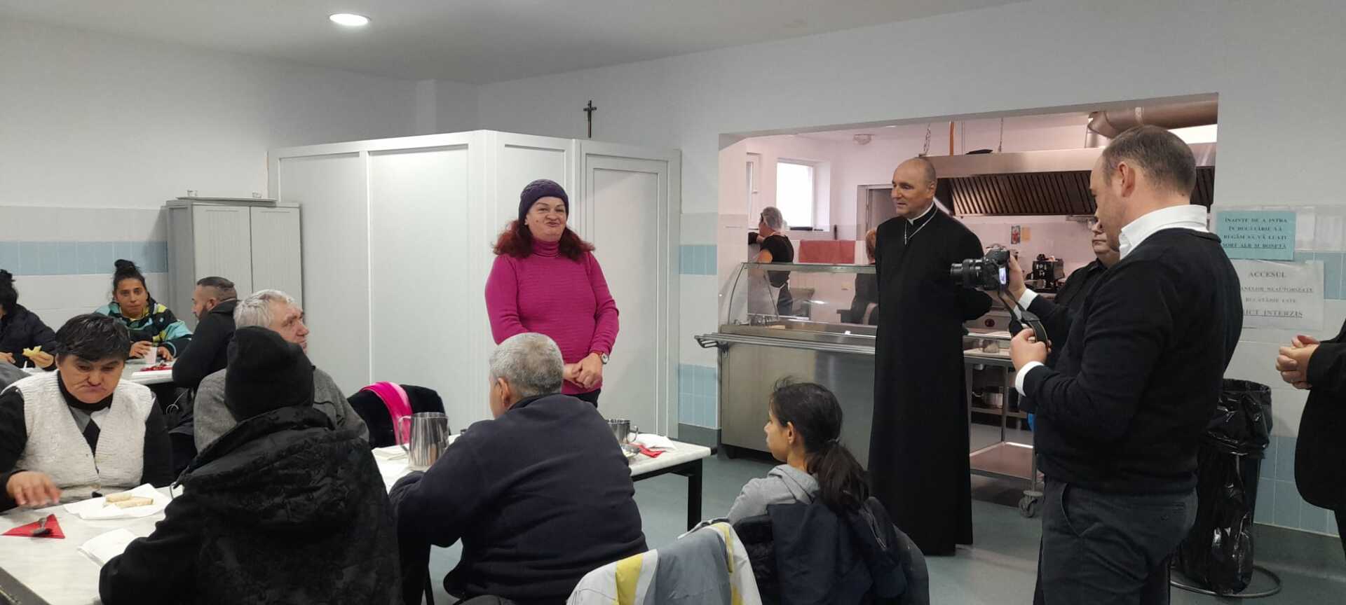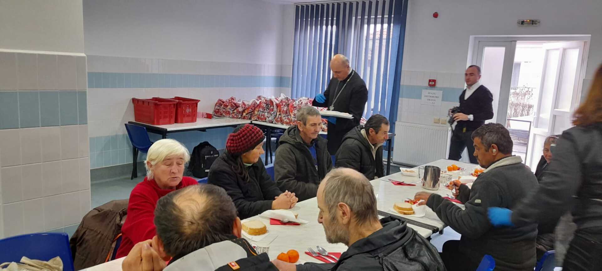 Un moment aparte în viața de zi cu zi a beneficiarilor cantinei sociale este evenimentul care a avut loc astăzi, 22 decembrie a.c., la cantina socială. Sărbătorind, în avans, Nașterea Mântuitorului, am avut oaspeți de seamă la cantină, iar conducerea Asociației Caritas Eparhial a pus umărul lângă cel al voluntarilor prezenți la pregătirea sălii de mese, la servirea beneficiarilor pe toată durata prânzului, precum și la curățenia din sala de mese.