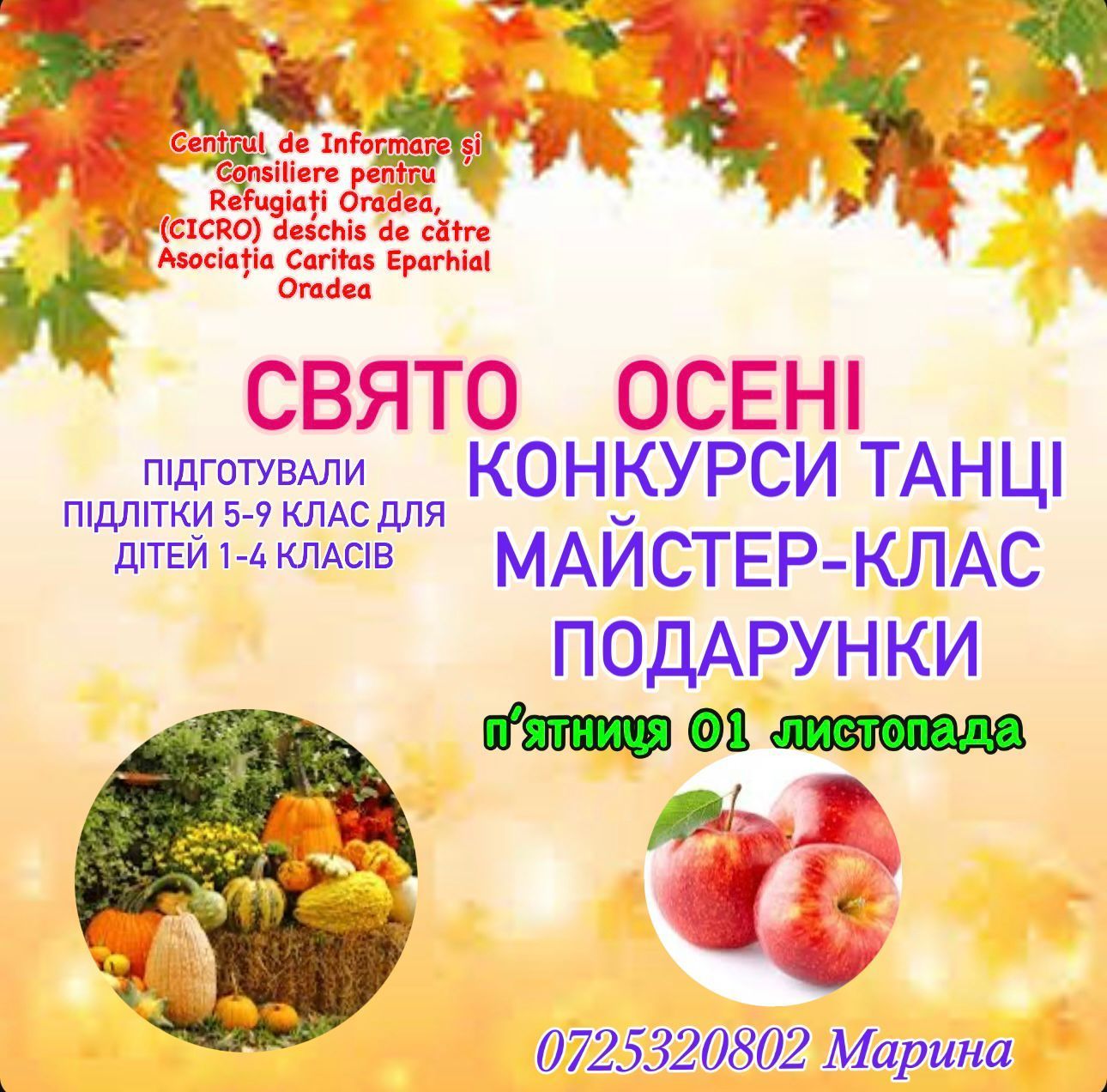 La începutul lunii noiembrie, copiii ucraineni care frecventează programele educaționale ale Centrului de Informare și Consiliere pentru Refugiați Oradea (CICRO), din cadrul Asociației Caritas Eparhial Oradea, au avut „Sărbătoarea Toamnei”. Evenimentul a fost pregătit de către adolescenții centrului pentru copiii din clasele primare. Copiii au spus poezii dedicate toamnei, au răspuns la ghicitori pe tema anotimpului auriu și au organizat concursuri.