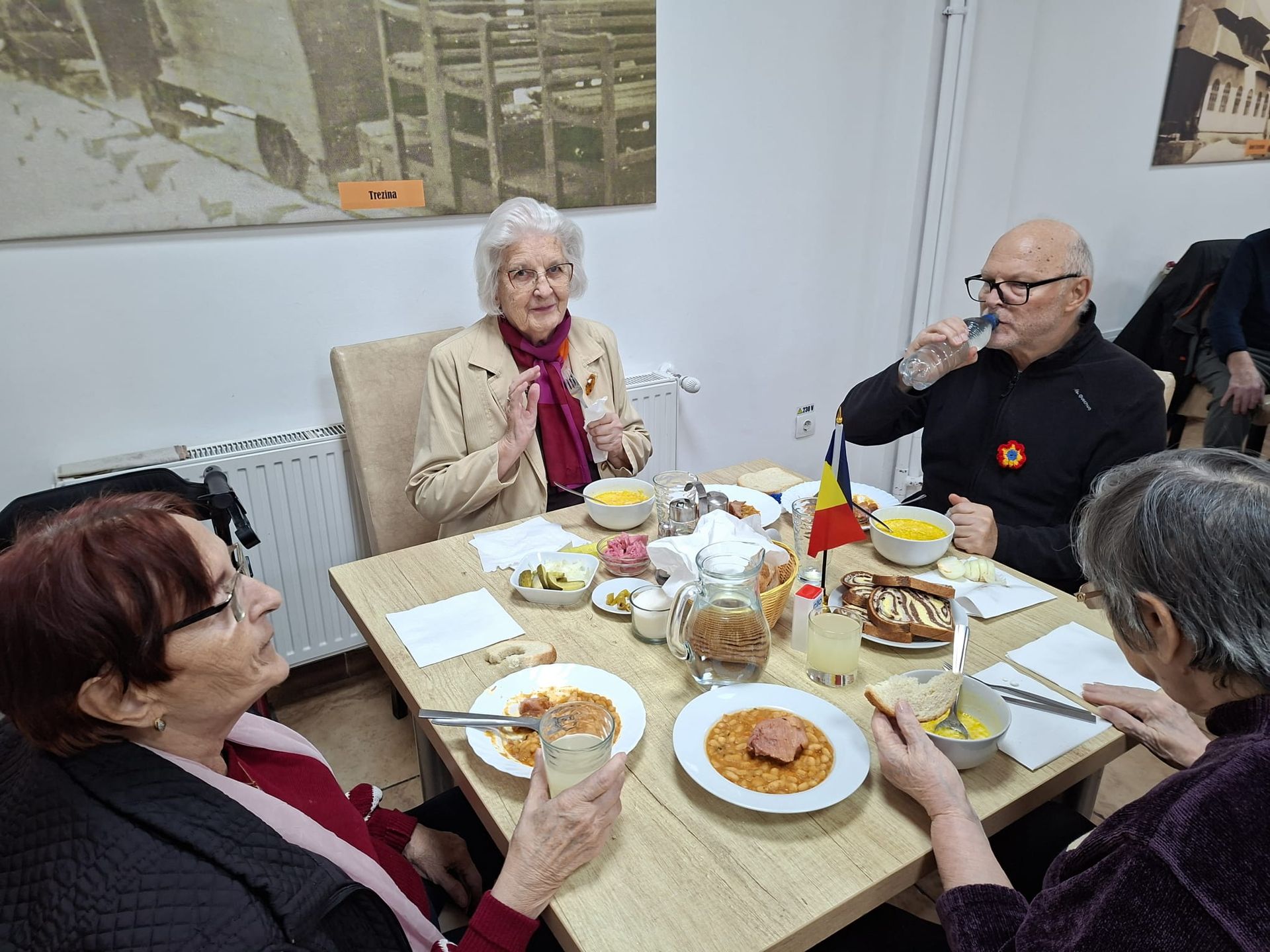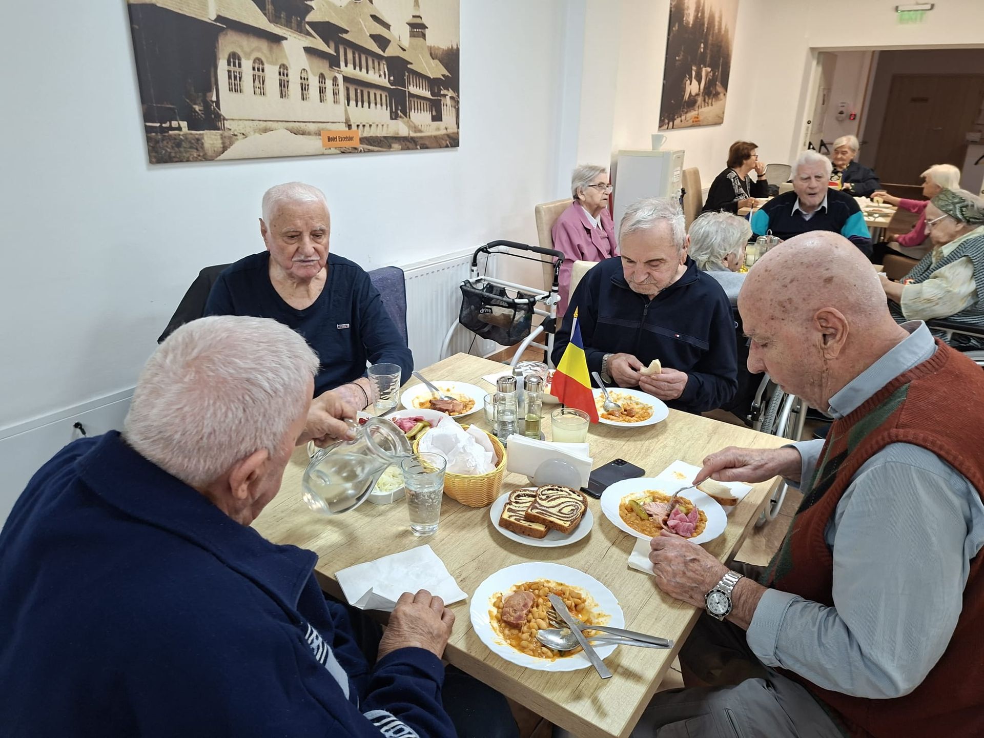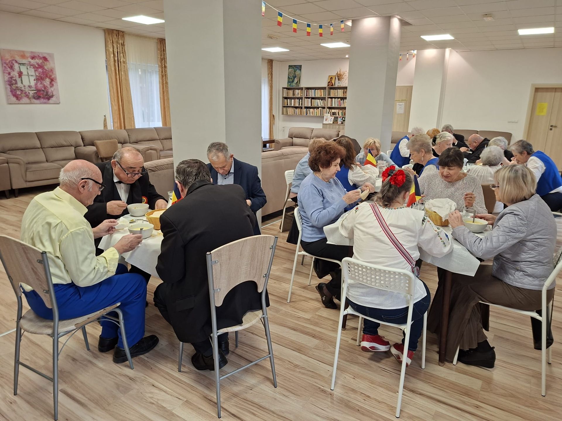 După programul artistic, atmosfera s-a mutat în jurul mesei de prânz, unde oaspeții și rezidenții au servit un meniu tradițional: ciorbă de burtă, fasole cu ciolan, ceapă, ardei iute și cozonac.
