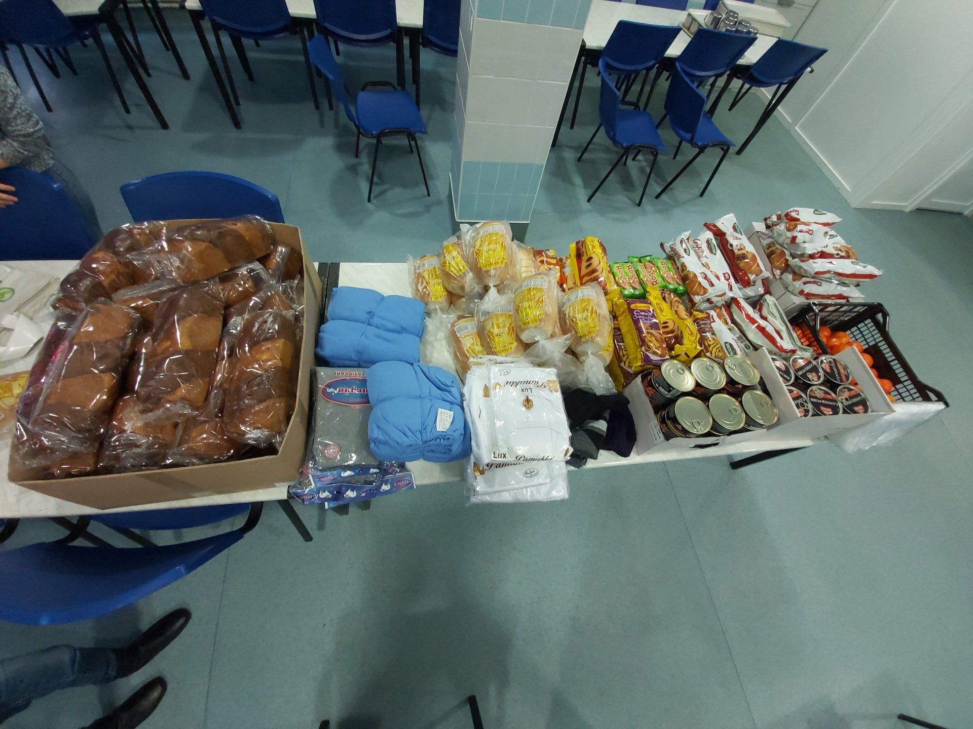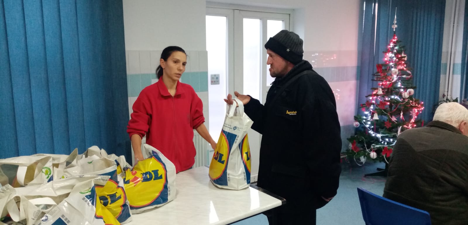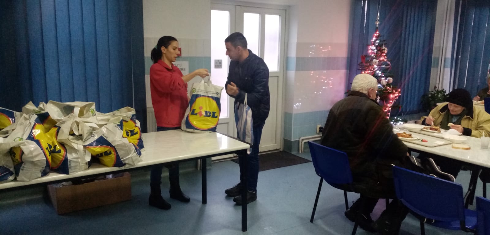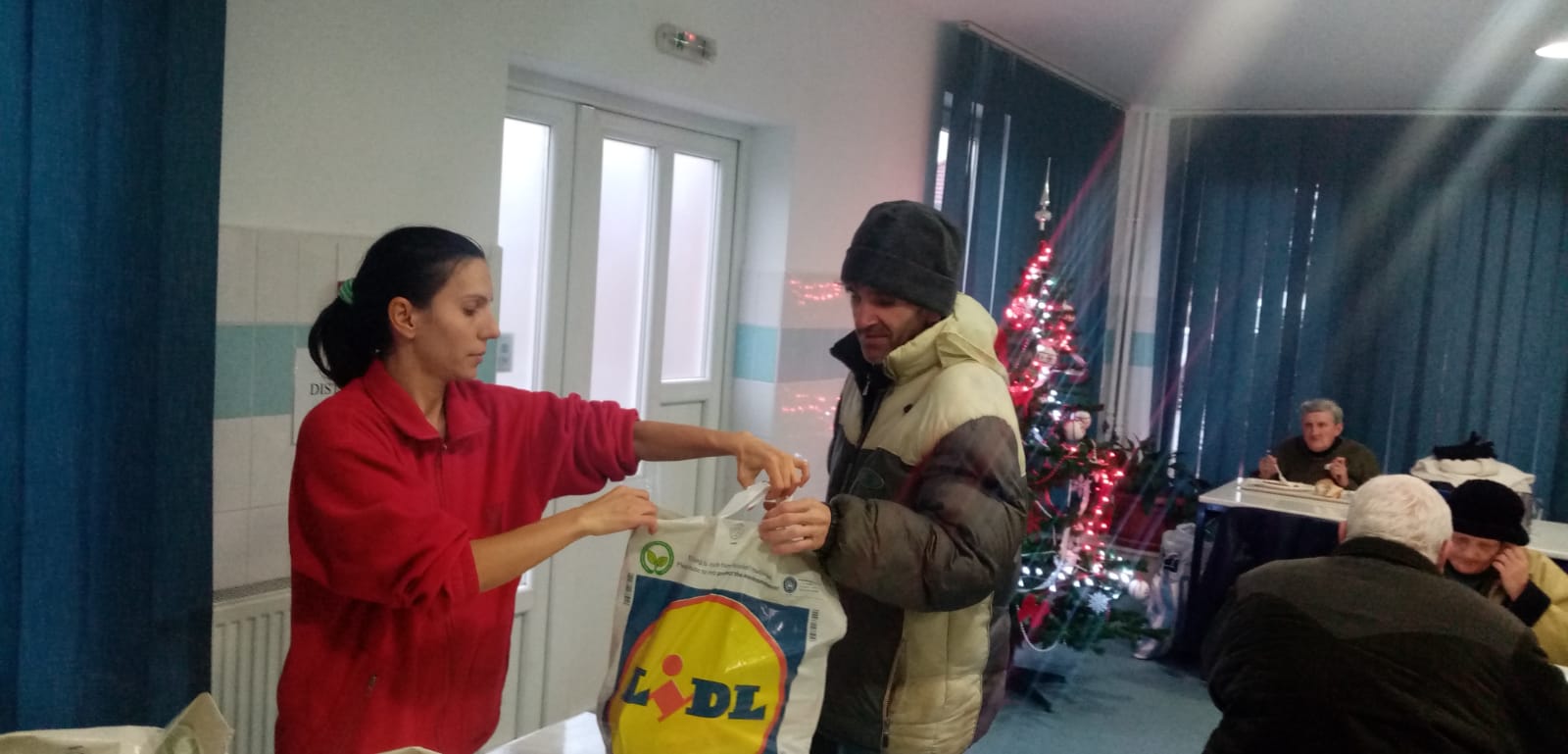 Beneficiarii care au venit la cantina socială astăzi, 24 decembrie a.c., au pășit în același loc atât de familiar lor unde nu de puține ori sunt copleșiți de surprize care le redau sentimentul de apartenență la un grup și, întâmpinați cu atenție și grijă pentru fiecare în parte, după servirea mesei de prânz, au primit pachet cu alimente și dulciuri pentru următoarele zile ale acestei sărbători. Astfel au dus cu ei câte un cozonac, pâine, conserve, napolitane, croissante și clementine. Totodată, au găsit în pachet câte o pereche de mănuși, de ciorapi, câte o căciulă și articole de îmbrăcăminte pentru igiena corporală.