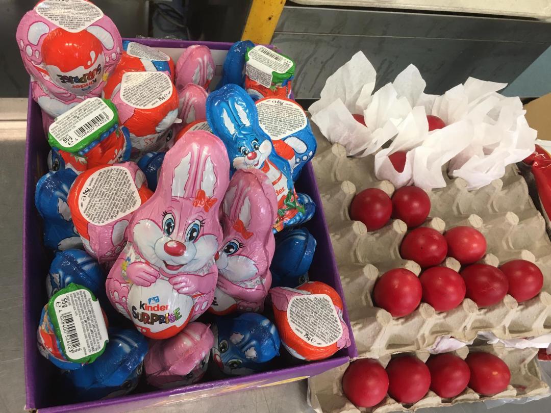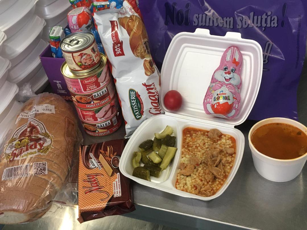 Aşadar, în urma donaţiilor pentru această perioadă, beneficiarii au primit, acolo unde locuiesc, surprize dulci care le-au adus zâmbetele de care ne este dor să le vedem în cantină, la masă, în timpul servirii prânzului în condiţii decente şi într-o atmosferă prietenoasă. Bunăvoinţa donatorilor cărora le aducem sincere mulţumiri s-a concretizat în napolitane, cornuri cu ciocolată, iepuraşi din ciocolată şi conserve pentru zilele în care nu se va găti în cantină. Astfel, acest sprijin a întregit meniul oferit de noi: supă ţărănească cu legume şi carne de porc, cuşcuş cu carne de porc şi castraveţi muraţi, ouă roşii, precum şi pâinea necesară lor în aceste zile.