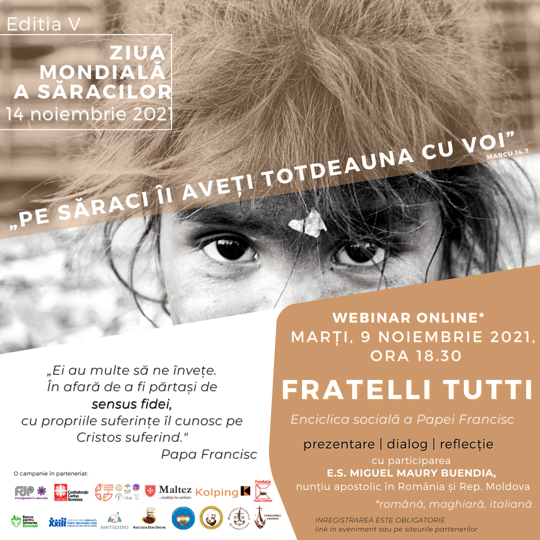 FDP – Protagoniști în educație, Acțiunea Catolică România, Confederația Caritas România, Serviciul de Ajutor Maltez în România, Kolping România, Fundația Hans Lindner, Mișcarea Sant’Egidio, Carmelitanele Misionare, Asociația Don Orione, Misionarii lui Padre Pio, Mișcarea Eclezială Carmelitană, Associazione Comunità Papa Giovanni XXIII, Asociația Umanitară "Il Chicco", Banca pentru Alimente București propun împreună în acest an o campanie online de mediatizare a mesajului Sfântului Părinte pentru această zi, precum și un webinar online - marți, 9 noiembrie 2021, de la ora 18.30 pe platforma Zoom și se va desfășura în trei limbi (română, italiană, maghiară) pentru a putea fi accesibil tuturor.