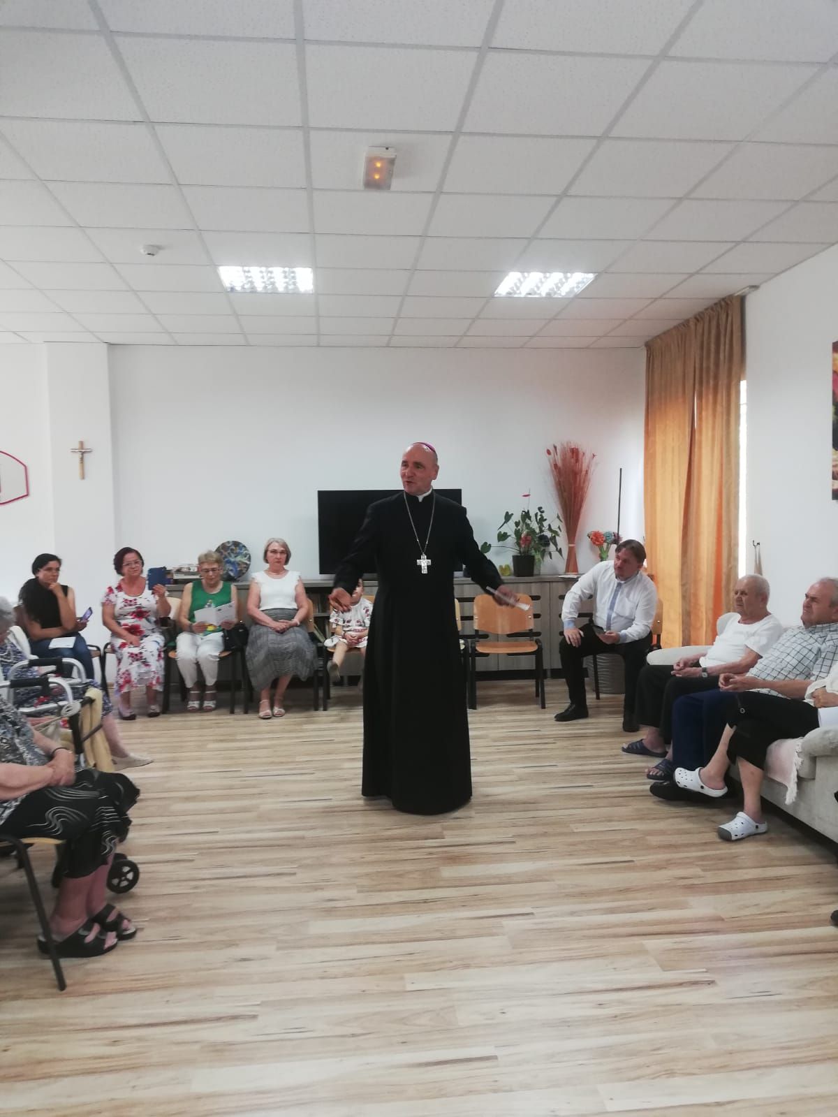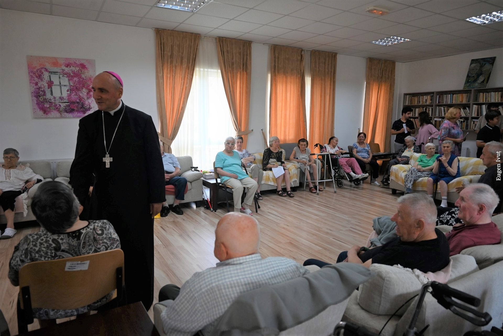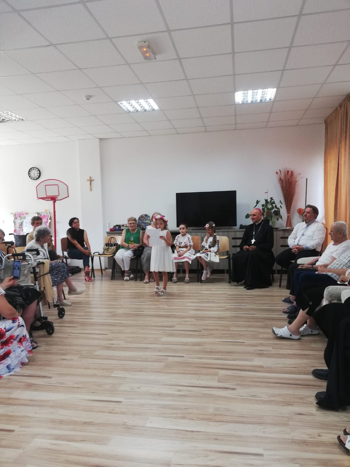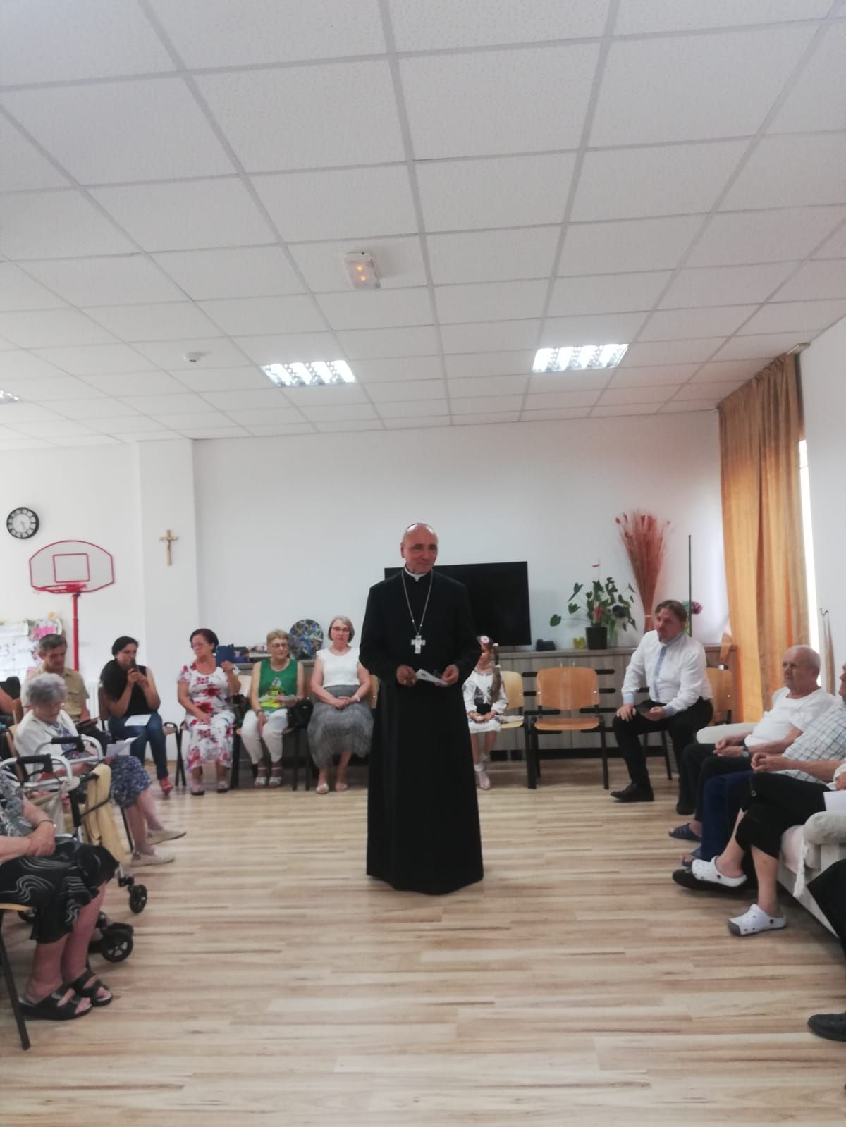În cuvântul său adresat bunicilor rezidenți, PSS Virgil a spus: ”Pentru toate bunele și relele din viața noastră trebuie să îi mulțumim înainte de toate lui Dumnezeu. Toți am avut și mai bune și mai puțin bune, dar dumneavoastră aveți acum înțelepciunea vieții. Și cu această înțelepciune a vieții vă regăsiți cu toții împreună în această casă de oaspeți. Și ne spune Mântuitorul că ”acolo unde sunt doi sau trei și eu sunt împreună cu ei” și asta înseamnă că Domnul este în fiecare zi cu dumneavoastră și printre dumneavoastră. De aceea eu vă îndemn să îi mulțumim Domnului, să ne bucurăm de zilele pe care le avem, așa cum sunt, mai bune sau mai grele și, în același timp, să ne ajutăm unii pe alții. La intrare mi-au spus două doamne că ”ne ajutăm una pe alta”. Este extraordinar de frumos când reușim, așa cum suntem, să ne ajutăm unul pe celălalt chiar dacă, foarte adesea, nu putem să ne ajutăm unul pe celălalt decât cu un zâmbet sau un cuvânt bun. Dar dacă putem să îi spunem celui de lângă noi un cuvânt bun și să-i zâmbim, am făcut cel mai mare și mai frumos lucru. Eu vă doresc tuturor ani buni și binecuvântați de Domnul căci, dacă există un pic de bunătate și binecuvântarea Domnului, putem să mergem înainte. Lăudat să fie Isus Cristos. Vă îmbrățișez pe toți!”